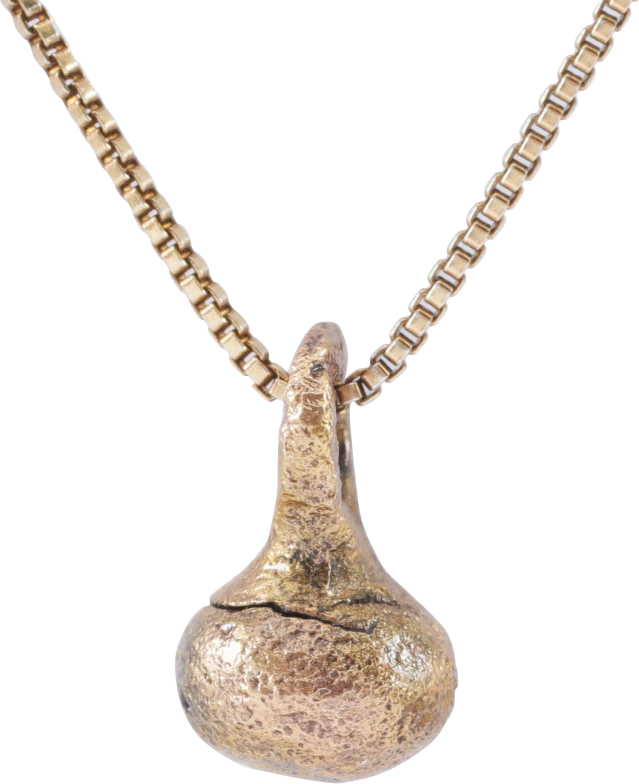 These small pendants were popular among common women in ancient Rome. Some have been described as prostitute’s pendants and that view is widely published on the internet. This example is of inverted conical form with stepped baluster finial. It is 7.6mm, over 1/4" (0.30”) diameter. It has been professionally refurbished with the 24karat gold surface restored. It is suspended on an 18” gilt sterling silver neck chain for modern wear and is jewelry gift boxed with a certificate of authenticity.