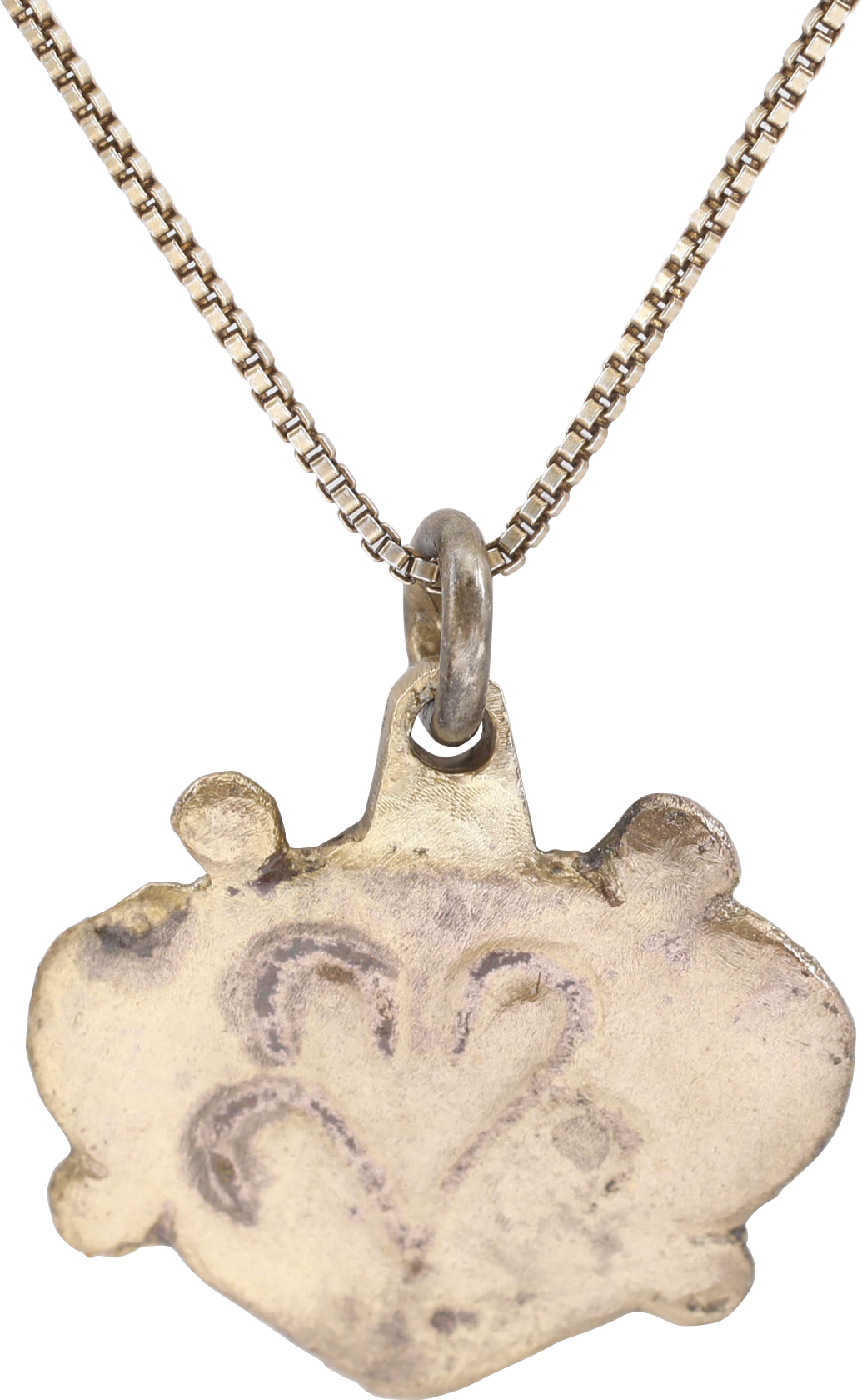 Danelaw England. Gilt bronze. Over 3/4” (0.80”) total height. Iconic heart form, with nubs at the quarter points describing a saltire. The field has an inscribed floral motif, a variant of the popular trefoil. The heart stood for bravery, fortitude, loyalty, integrity, all attributes of the Viking warrior. It is abundantly referenced in Viking literature. Professionally refurbished with the 24karat gold surface restored on an 18” gilt sterling silver neck chain for modern wear. Gift boxed with certificate of authenticity. Exceptional condition.