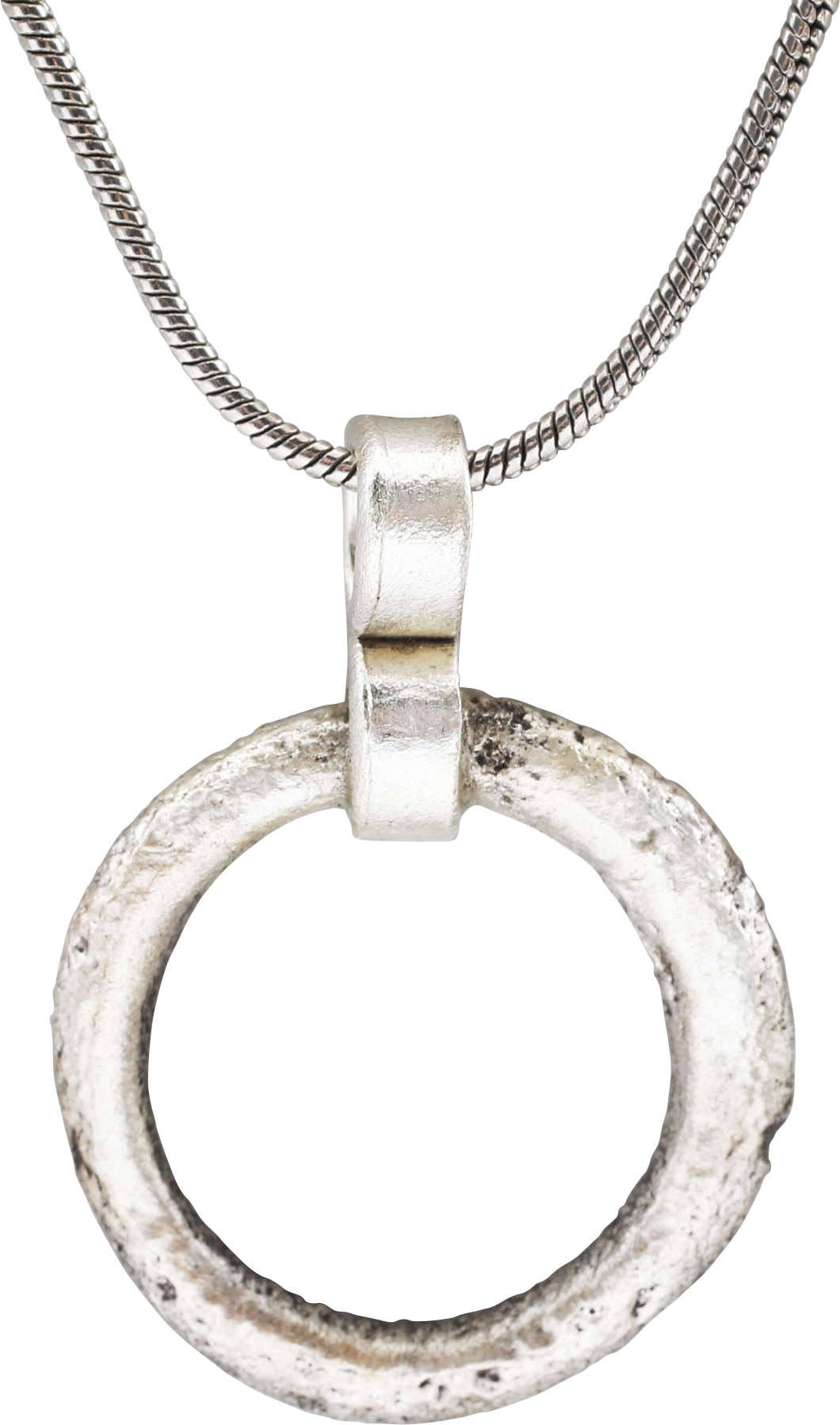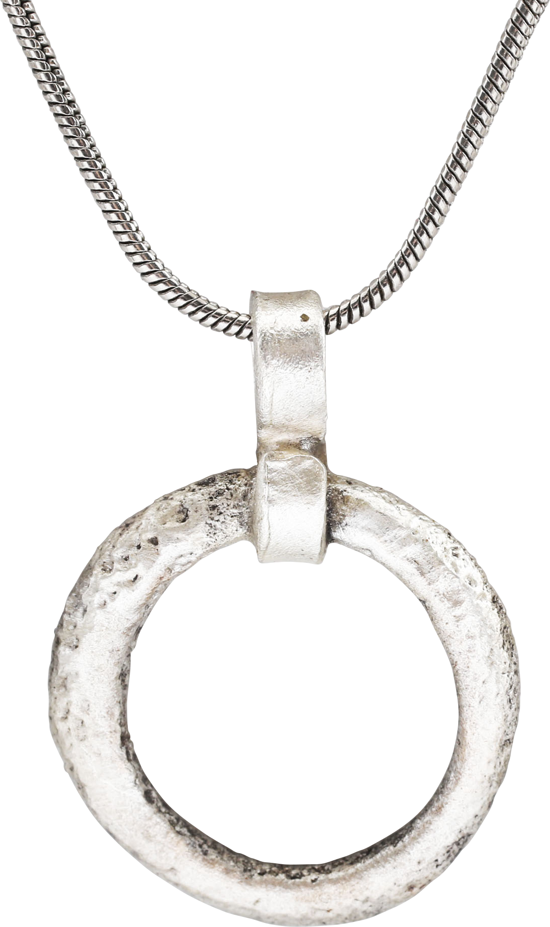 Before the Roman invasion of the British Isles, rings of bronze, silver, and gold were used as a means of exchange, particularly in Ireland. Most exchanges of goods and property were conducted by barter based on shrewd evaluations in each specific situation. Some, including bride prices, later to be called dowries, needed to be more accurately quantified. These rings fulfilled that need as well as providing a palpable demonstration of value. They were worn, sewn to men’s leather jerkins as displays of prosperity. Further, when worn in sufficient numbers, they provided substantial protection from an edged weapon attack. So very like armor in the Middle Ages, they advertised that the wearer was successful economically which translated both by implication and demonstration that he was a formidable objective, best left in favor of something more easily overcome. This example is over ¾” (0.80”) in diameter. The surface is textured from burial. Professionally refurbished with the silver overlay restored and suspended on a Sterling silver neck chain for contemporary wear. Gift boxed with a certificate of authenticity.