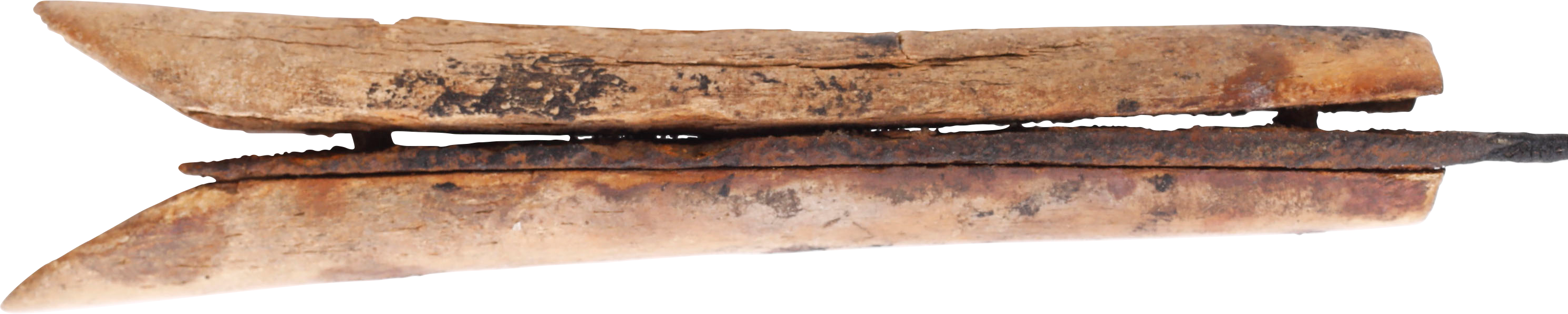 8 1/8” length with 4 5/8” wedge section blade of thin fighting section with narrow back fuller each side. Flat tang with flared end bone grips. Both grips complete. One with open age crack. Stable excavated condition on Plexiglas display mount.