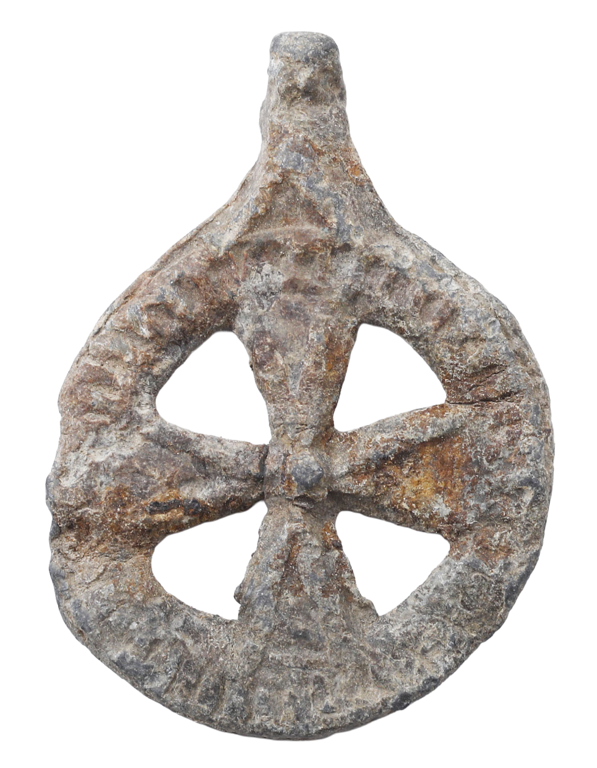 Circular, about 7/8” (0.91”) diameter. White metal, probably a tin-lead pewter alloy. Broad radially reed edge enclosing a pierced cross with beams flaring from the center as with the Maltese Cross. Raised central nub, possibly a reference to the earlier pagan Wheel of Fortune. Both sides are identical. The top with a flared thickened end nub for sewing to a garment, usually a hat, to advertise the wearer’s journey of faith. These were produced in the Holy Land for pilgrims who wore them at home as prestige symbols. They were sold at shrines of saints where holy relics of the saints, sometimes the whole corpus were preserved. The symbols are often specific to the life and achievements of the saint. Excellent preservation.