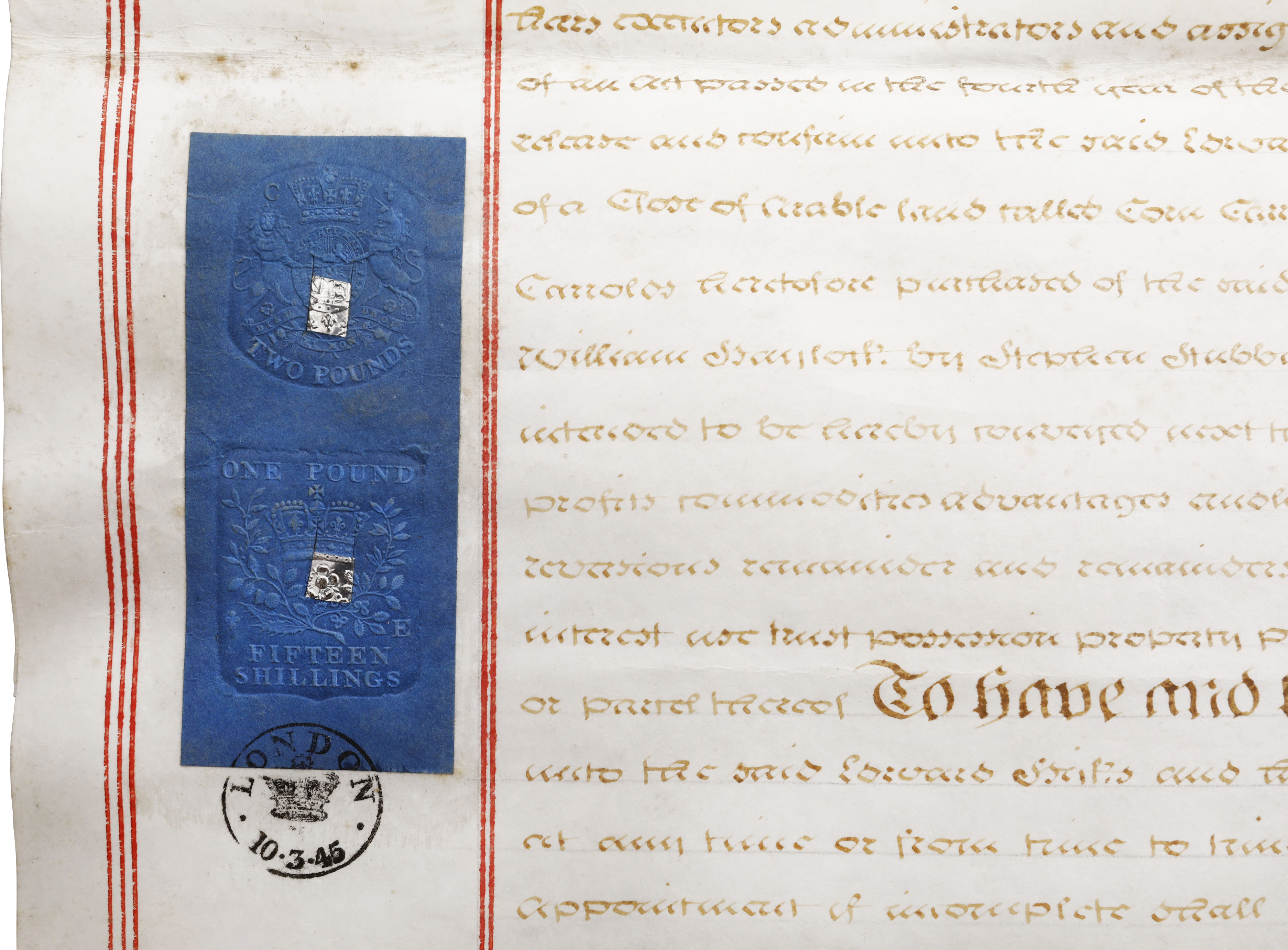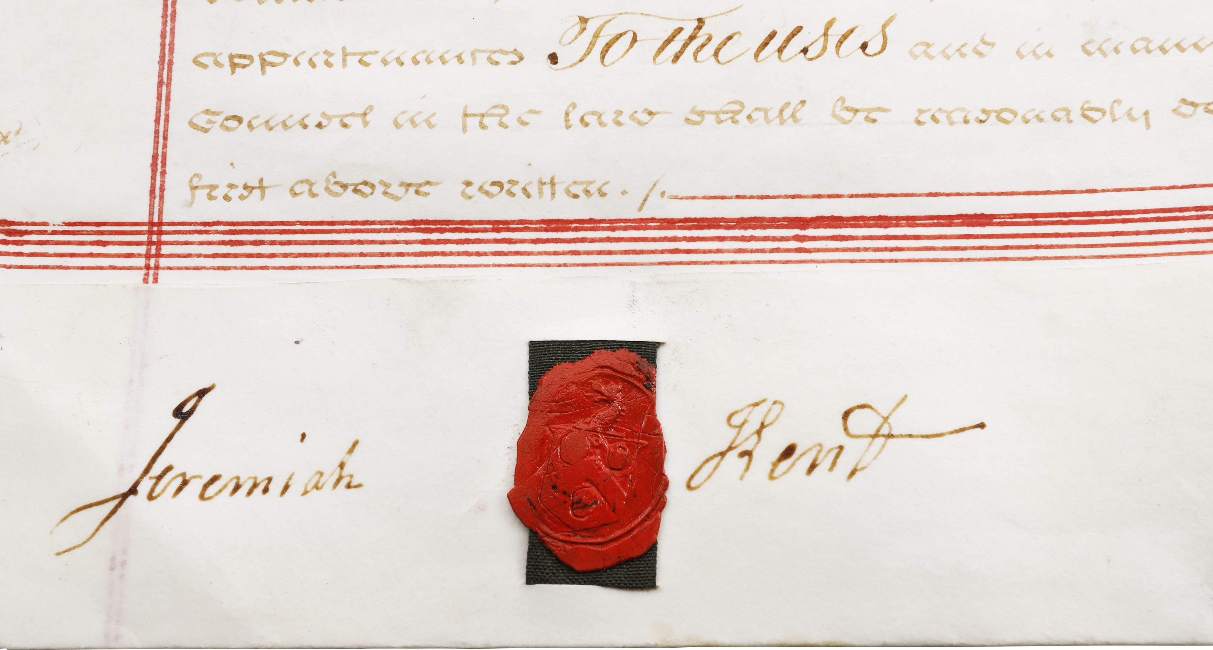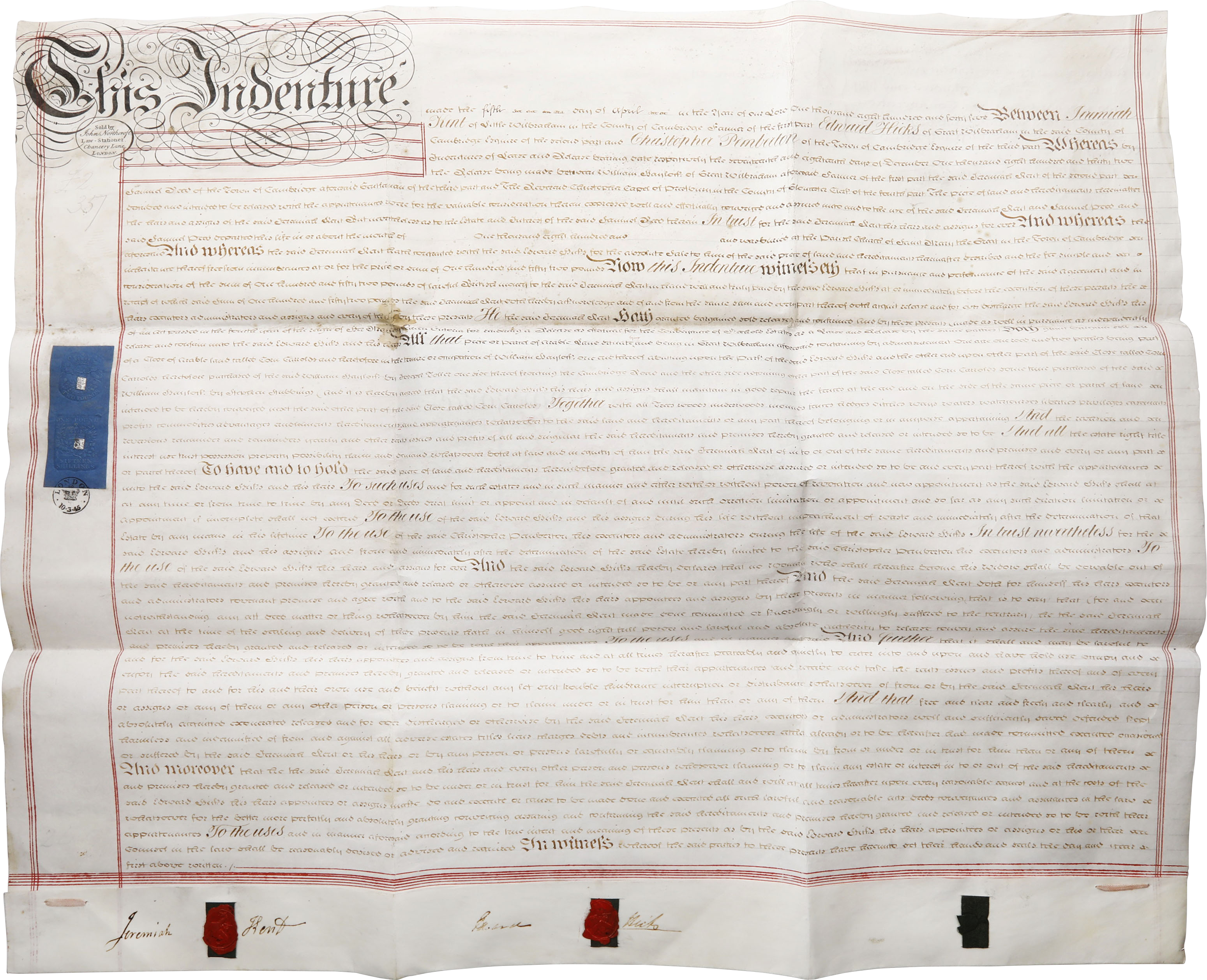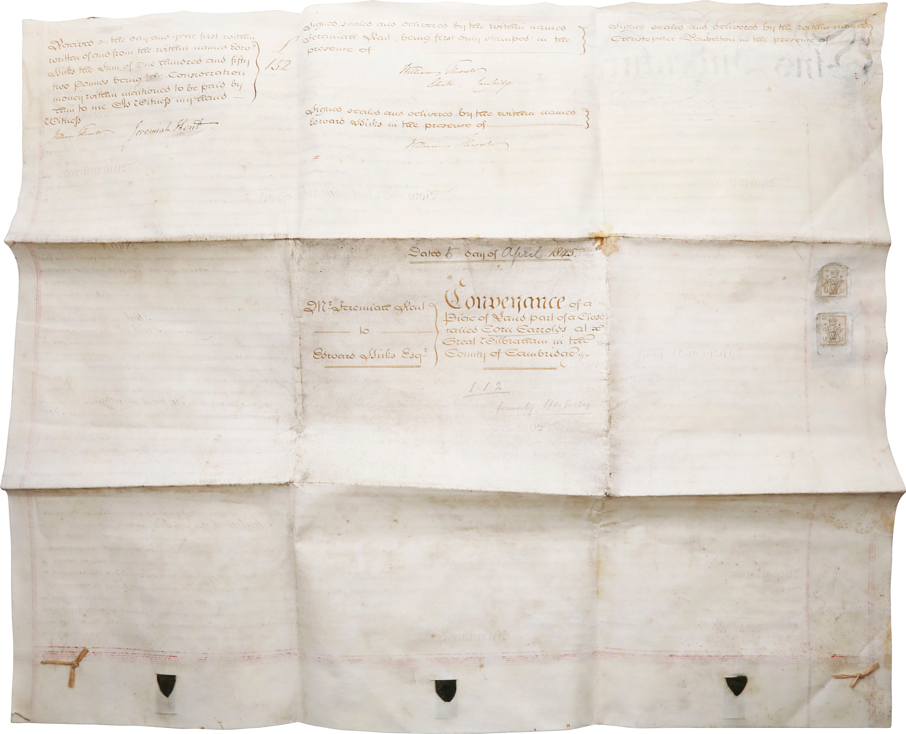 Fine large parchment (calf skin) document, 28 1//2” X 23 ½” for the sale of “a piece of land” in Cambridge. Jeramiah Kent and Edward Hicks, listed with signatures red wax sealed. Additional VR tax stamps and silver seals. Great for framing, particularly for a lawyer’s office.