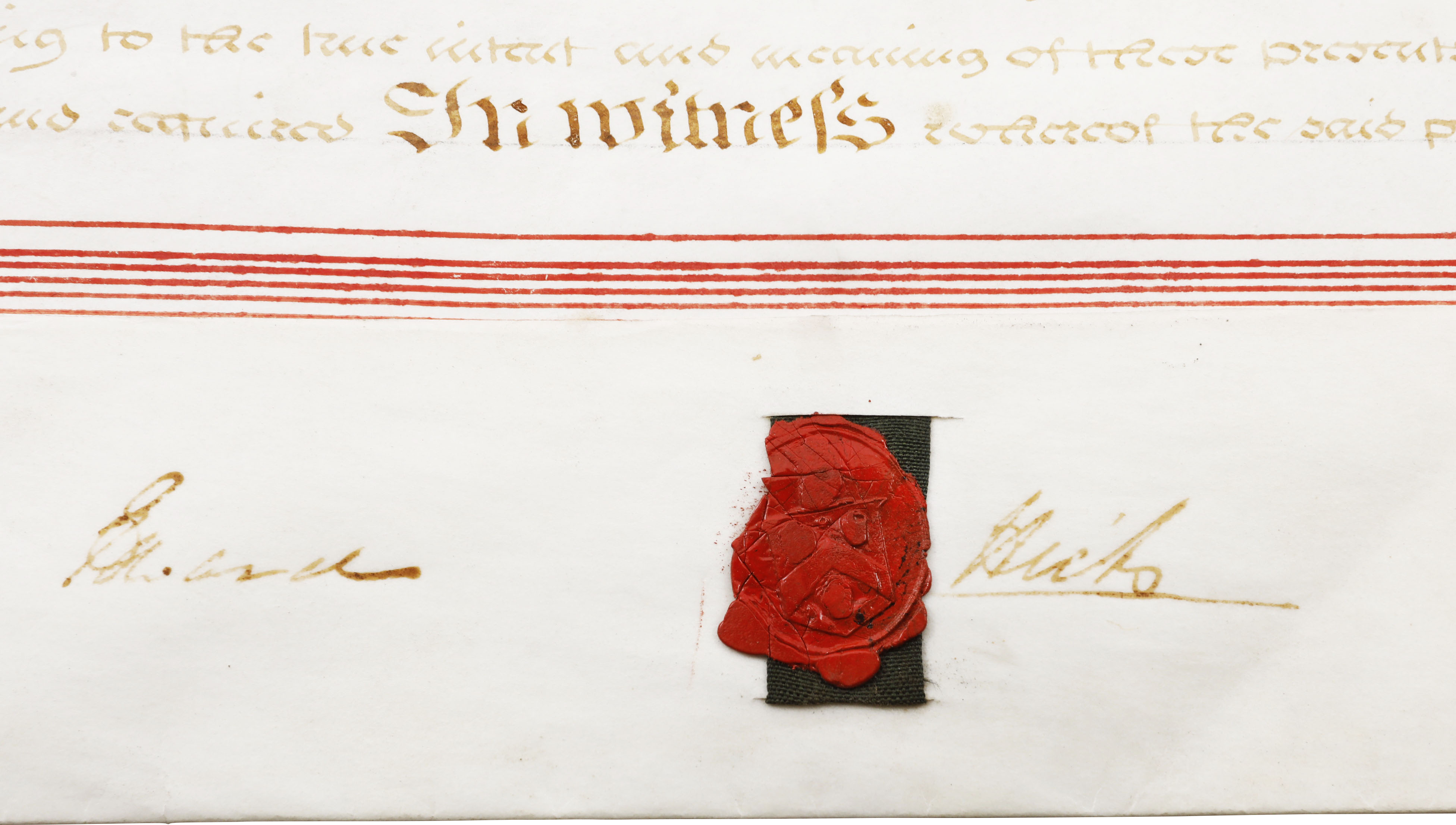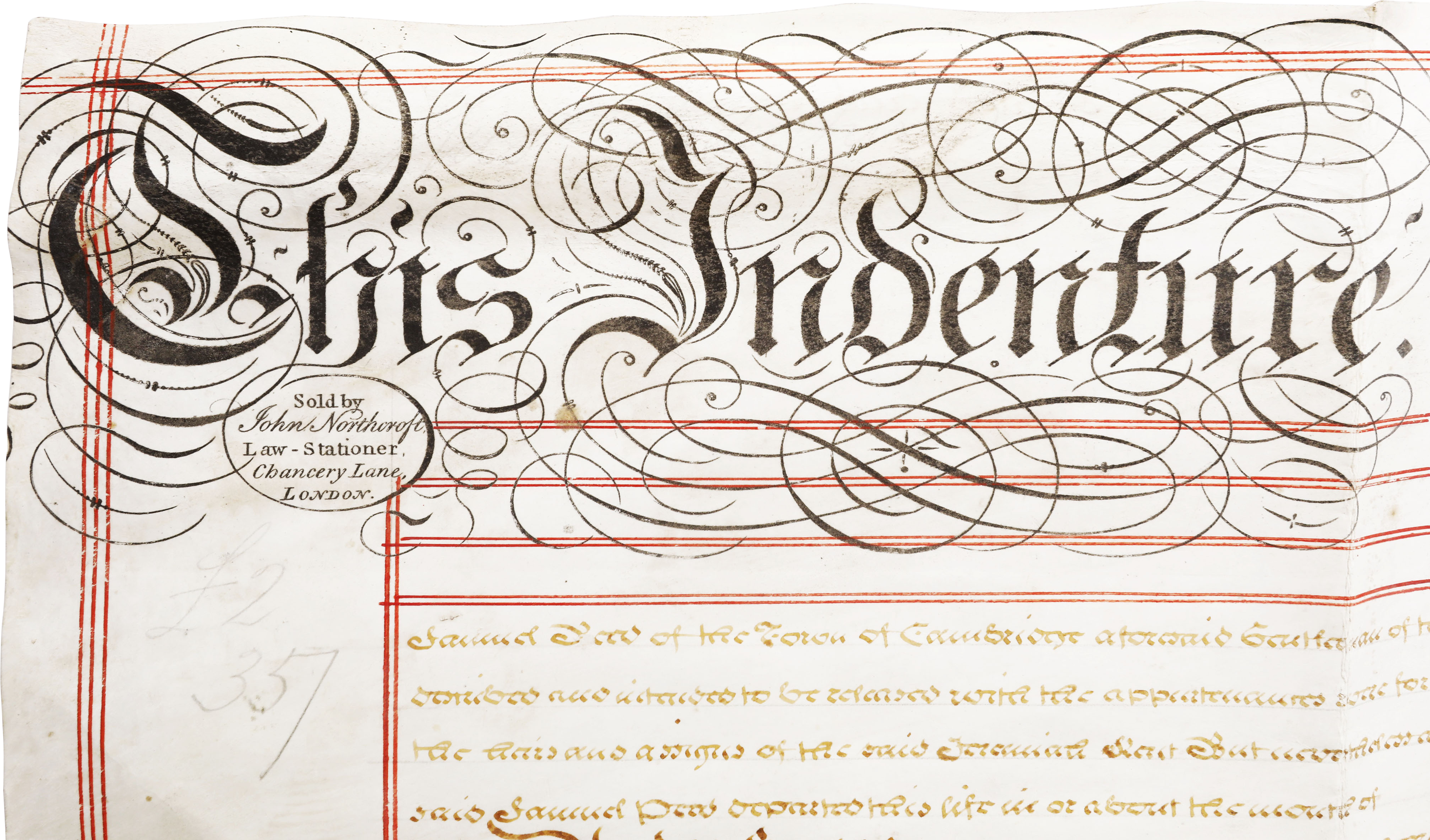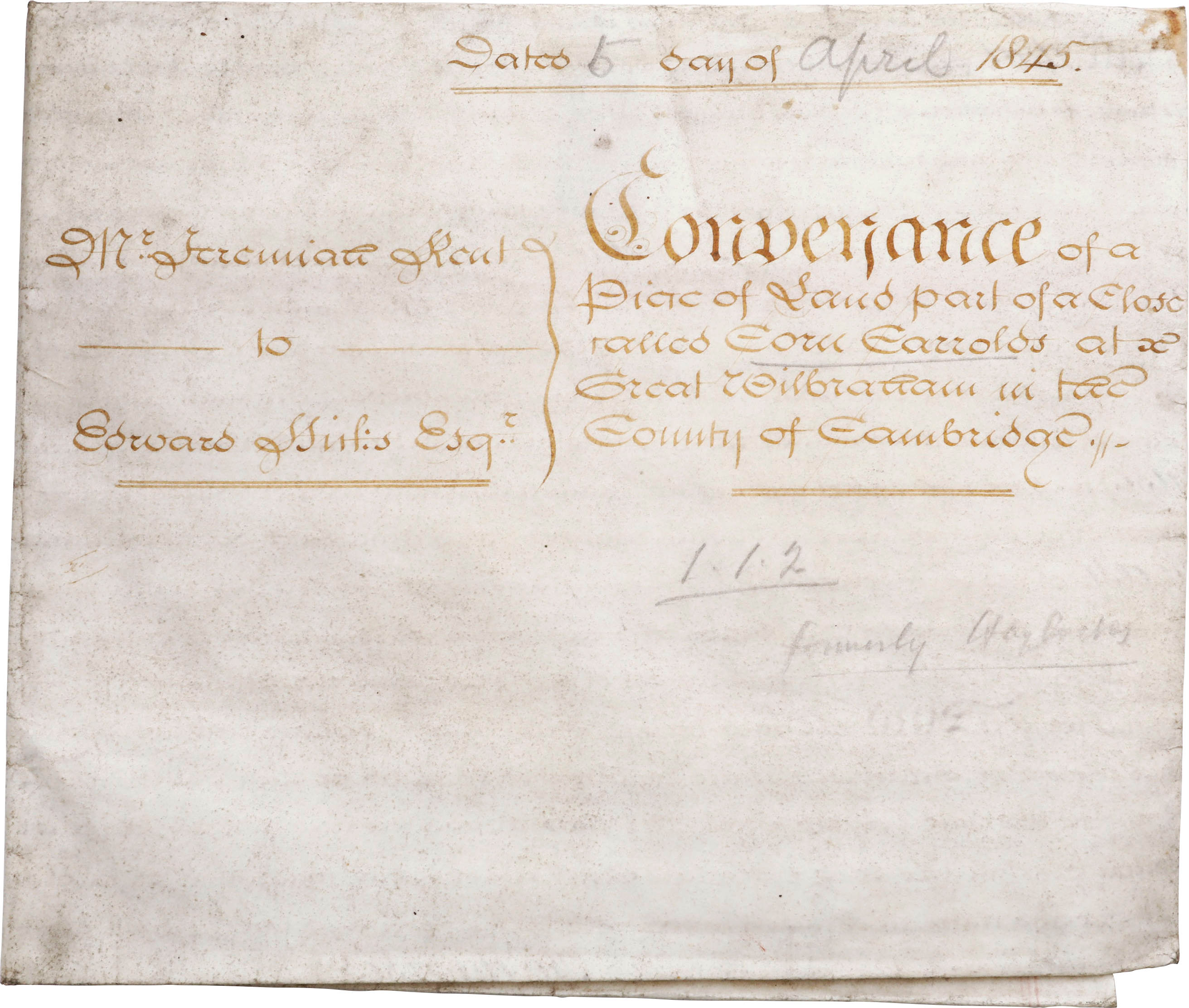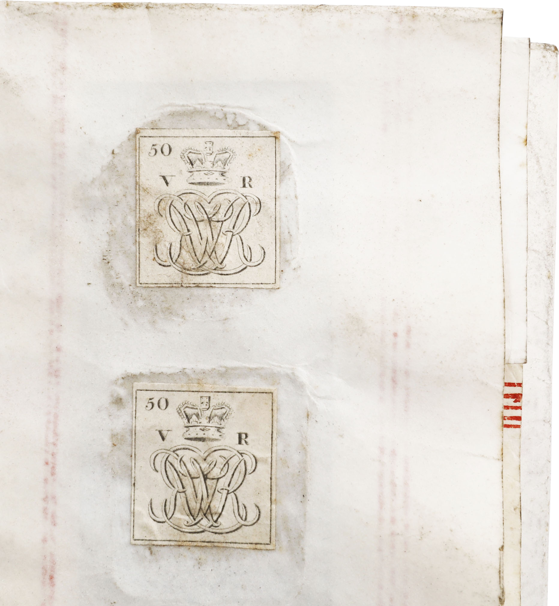 Fine large parchment (calf skin) document, 28 1//2” X 23 ½” for the sale of “a piece of land” in Cambridge. Jeramiah Kent and Edward Hicks, listed with signatures red wax sealed. Additional VR tax stamps and silver seals. Great for framing, particularly for a lawyer’s office.