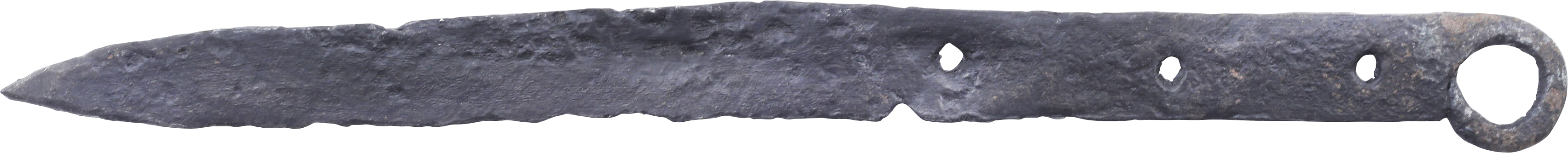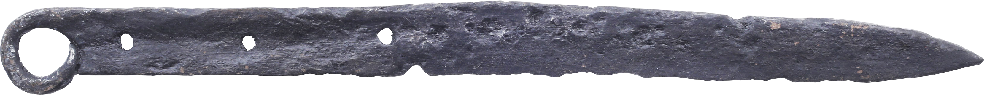 Forge iron 8 1/8” length. Wedge section blade  of relatively thin section made for slashing and thrusting. Forged tang with three holes for rivets to secure the antler or bone grips, now perished. Integral ring pommel with tapered tip, nesting in the tang end. Exceptional example preserved about as well as ever encountered. On a Plexiglas display stand with a certificate of authenticity.