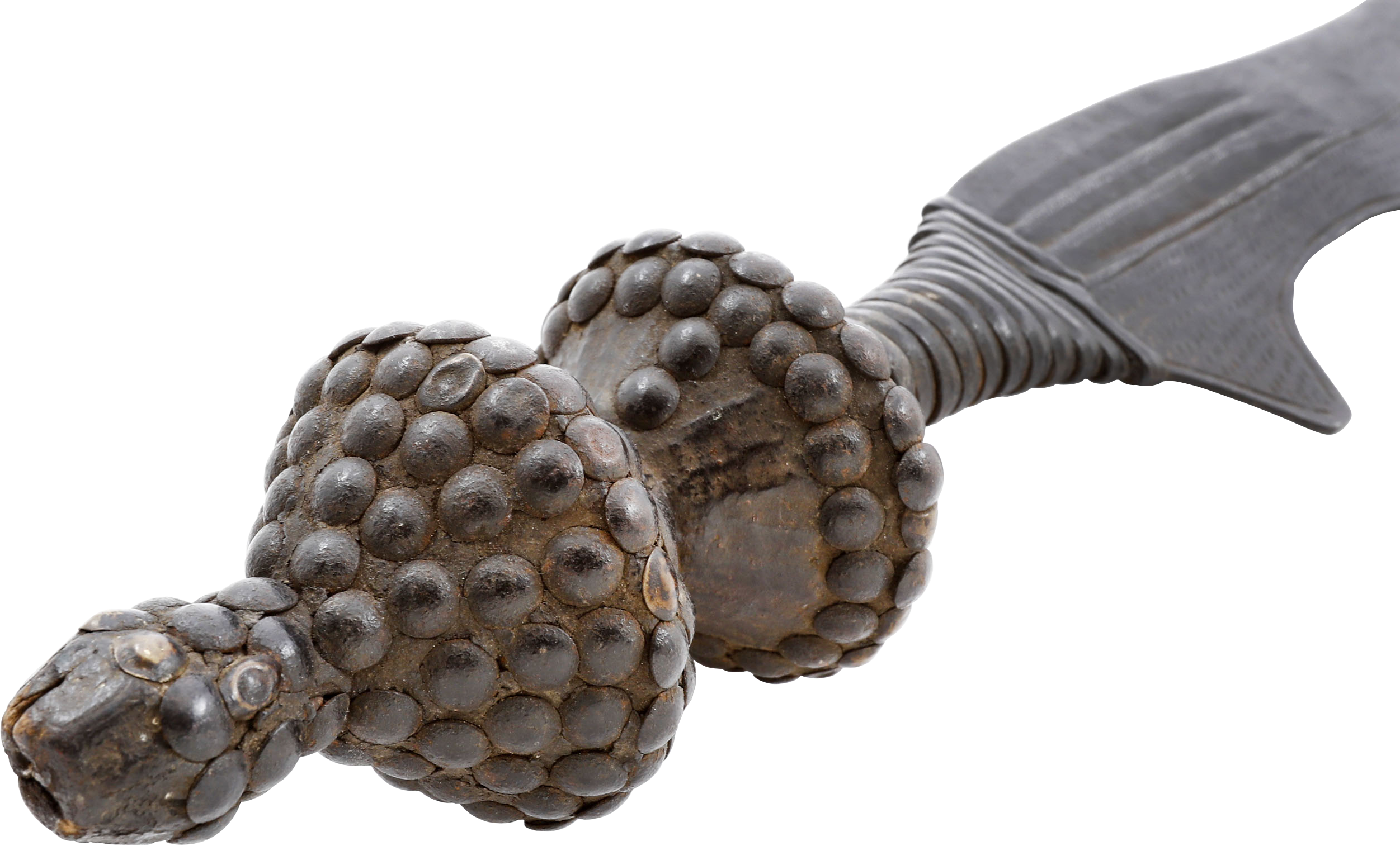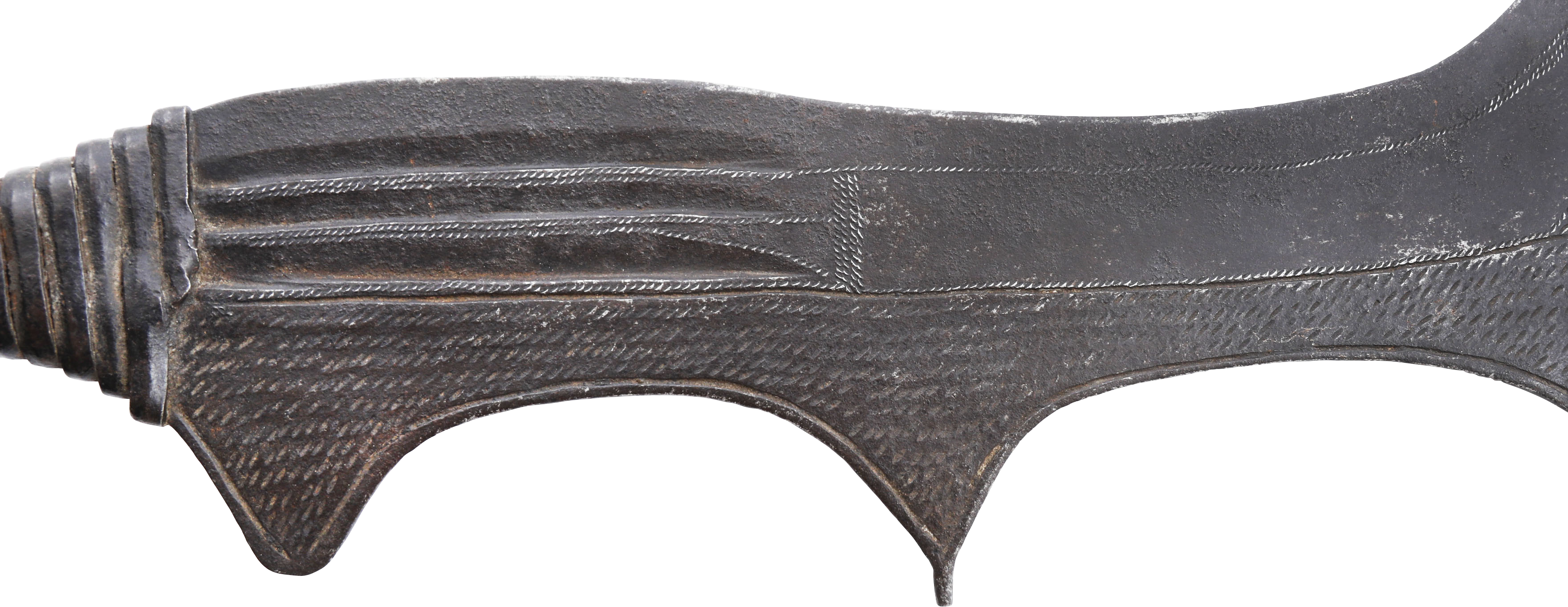 This example is 30 1/2” in length with an elegantly figural blade finely chiseled in basket weave panels along the scalloped back. The forte with three parallel stipple bands. Iron tape and twisted band wrapped grip and characteristic large double swelled tack decorated terminal counterbalancing the blade. Aside from their colorful context, these are among the most sought African weapons owing to their wonderful sculptural appeal. On display mount.