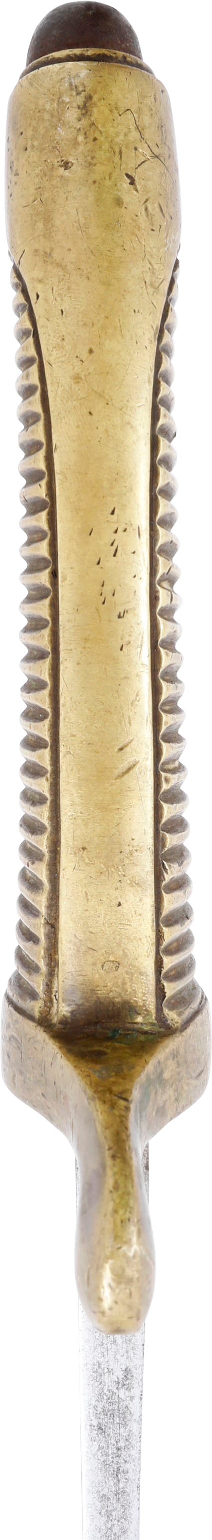 Briquet form based on the Napoleonic French model. Brass hilt with ribbed grip and domed iron pommel. 23” curved wedge section blade with crisp CA mark to the forte denoting government property. The Carabinieri are the fourth national military force of Italy. They serve as a national police, primarily carry out domestic and foreign policing duties.