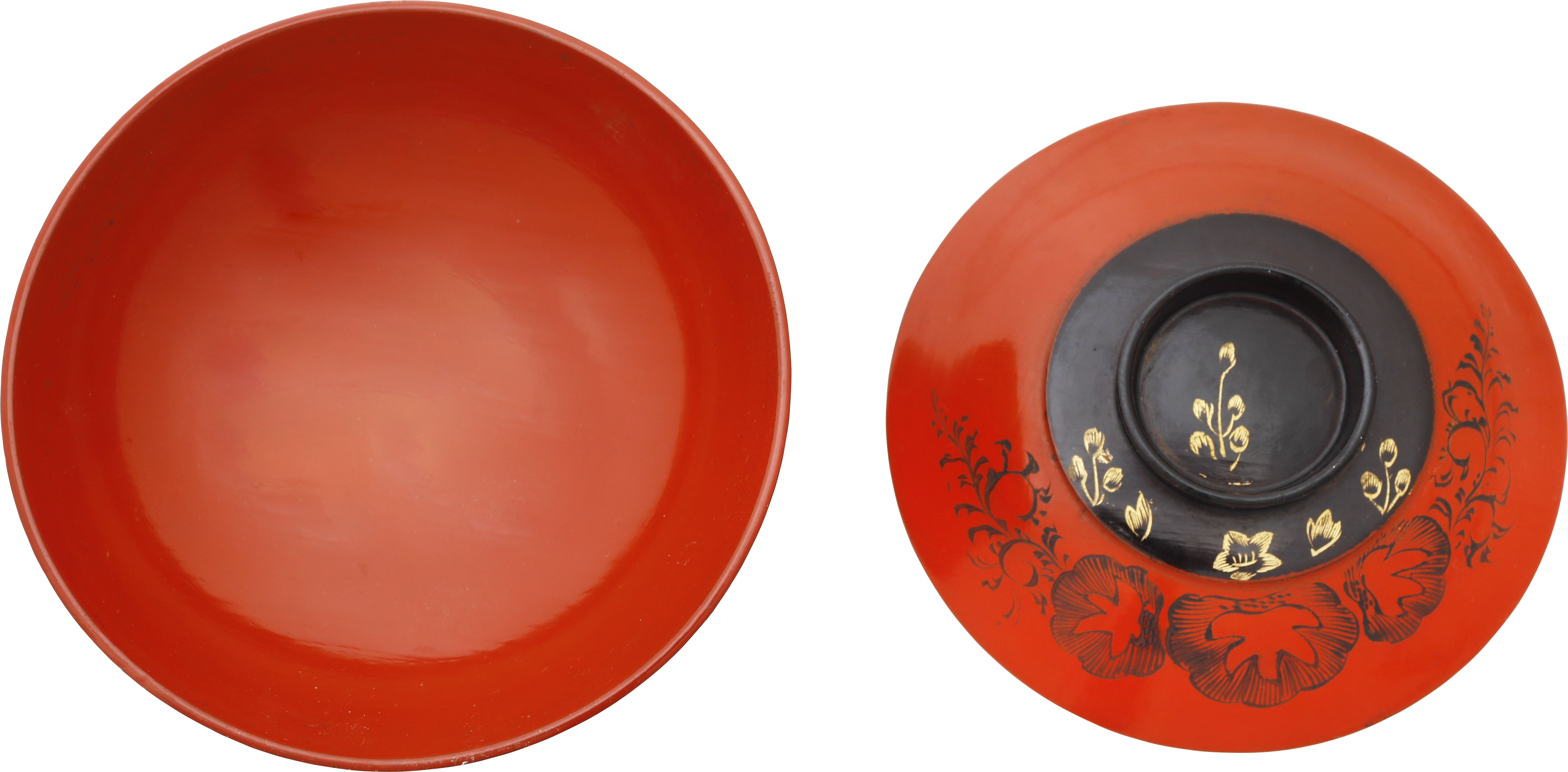 Meiji Period, 1867-1912. 4 3/4" diameter. Rounded with short steps to the top and bottom. Cylindrical foot and grip. Orange body color with black circular panel to the top and bottom. The top with gold flowers and foliage within the circle. The top, outside the circle, is decorated with foliage and flowers cut through the surface to the black undercoat. That work is in imitation of Chinese cut lacquer. The inside of the top with sprigs of gold foliage. Excellent with the wood grain reflected in the finish, attesting to its age.