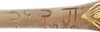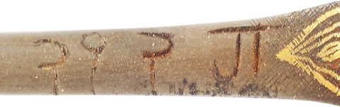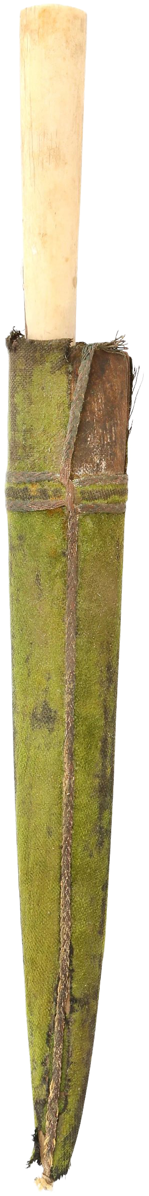 10 3/8” length with 6 3/8” wedge section blade. The back with an inscription and the bolster well decorated in gold koftgari foliage (strong and complete). One-piece ivory grip, the base cracked from the expansion of the tang and indicative of great age, probably 17th century. Original green velvet-covered scabbard with small segment lacking at the throat. A fine early example dating to the disposals of arms in response to the disenfranchisement of the maharajas in the early 1980s.