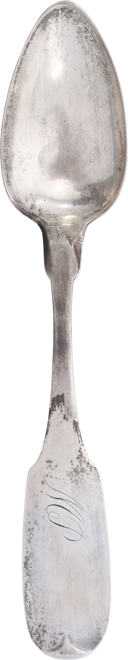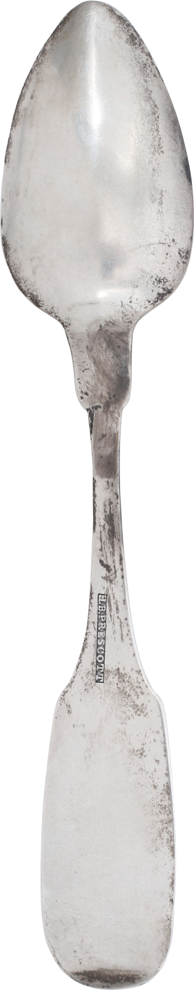 Tea spoon, 5 5/8” length of delicate proportions. The end with monogram M P and the reverse with maker’s name H B PRESCOTT. Found in Grosse Pointe Michigan, together with our B5226, inscribed Cadillac, and likely descended through the family of Antoine de la Cadillac, founder of Detroit in 1701. Worth research.