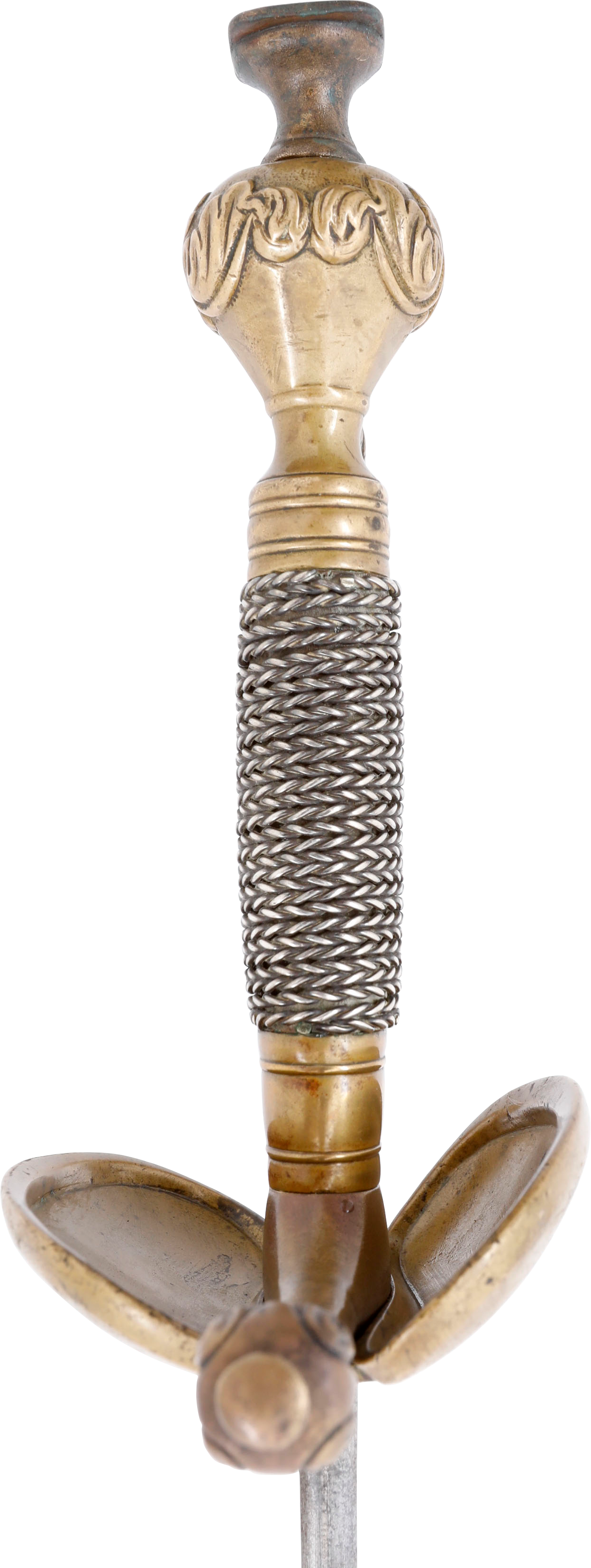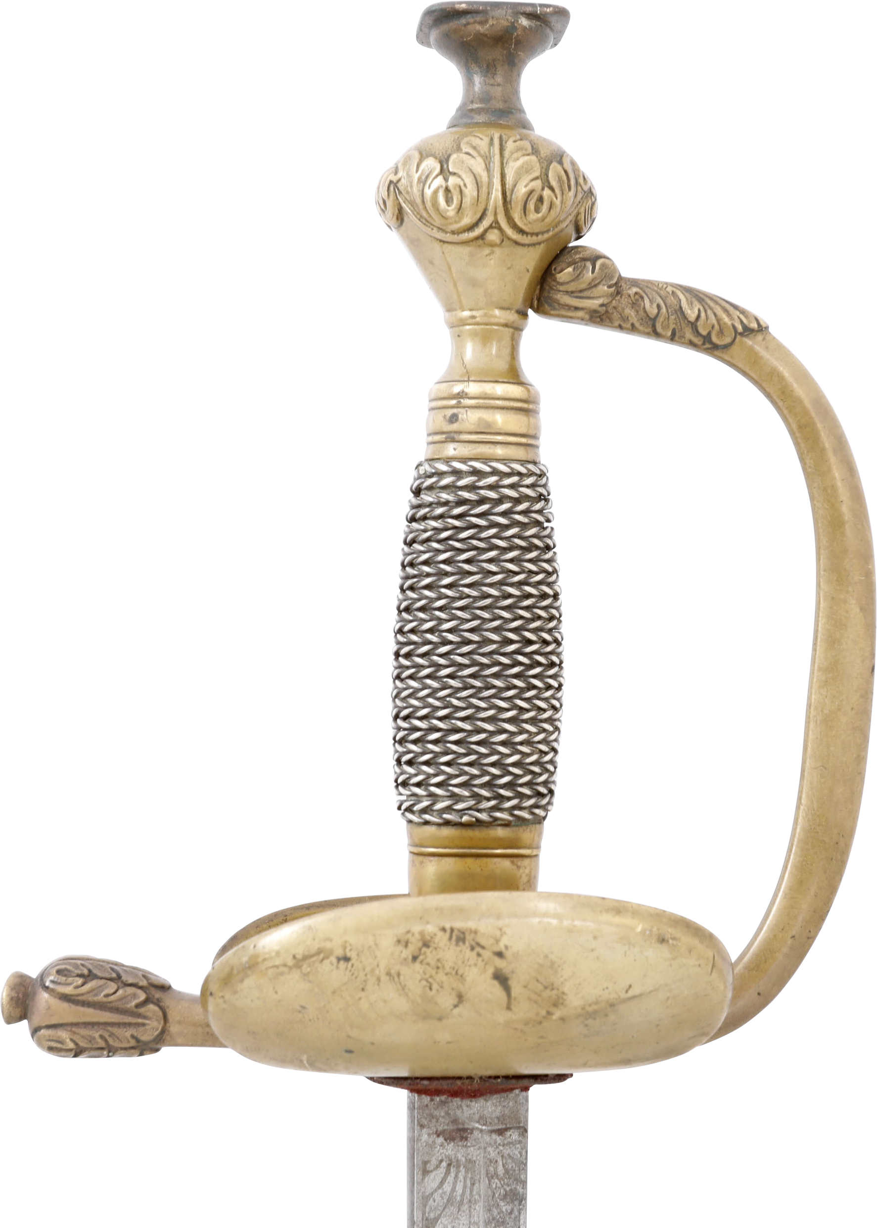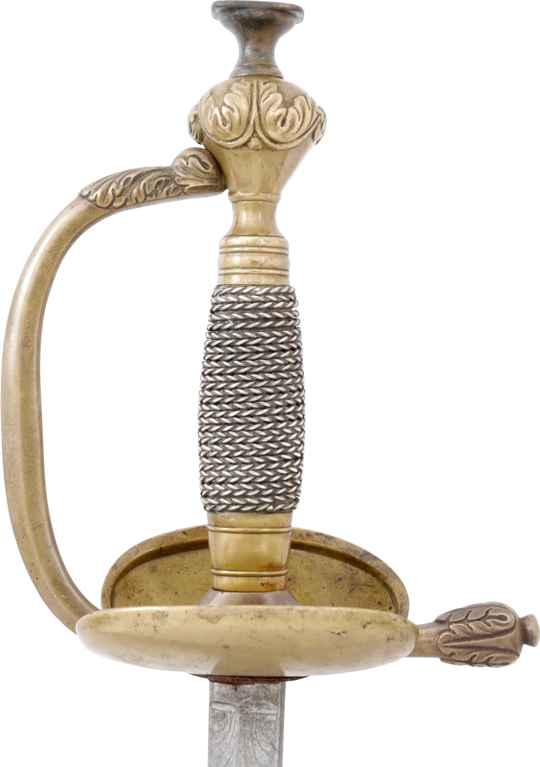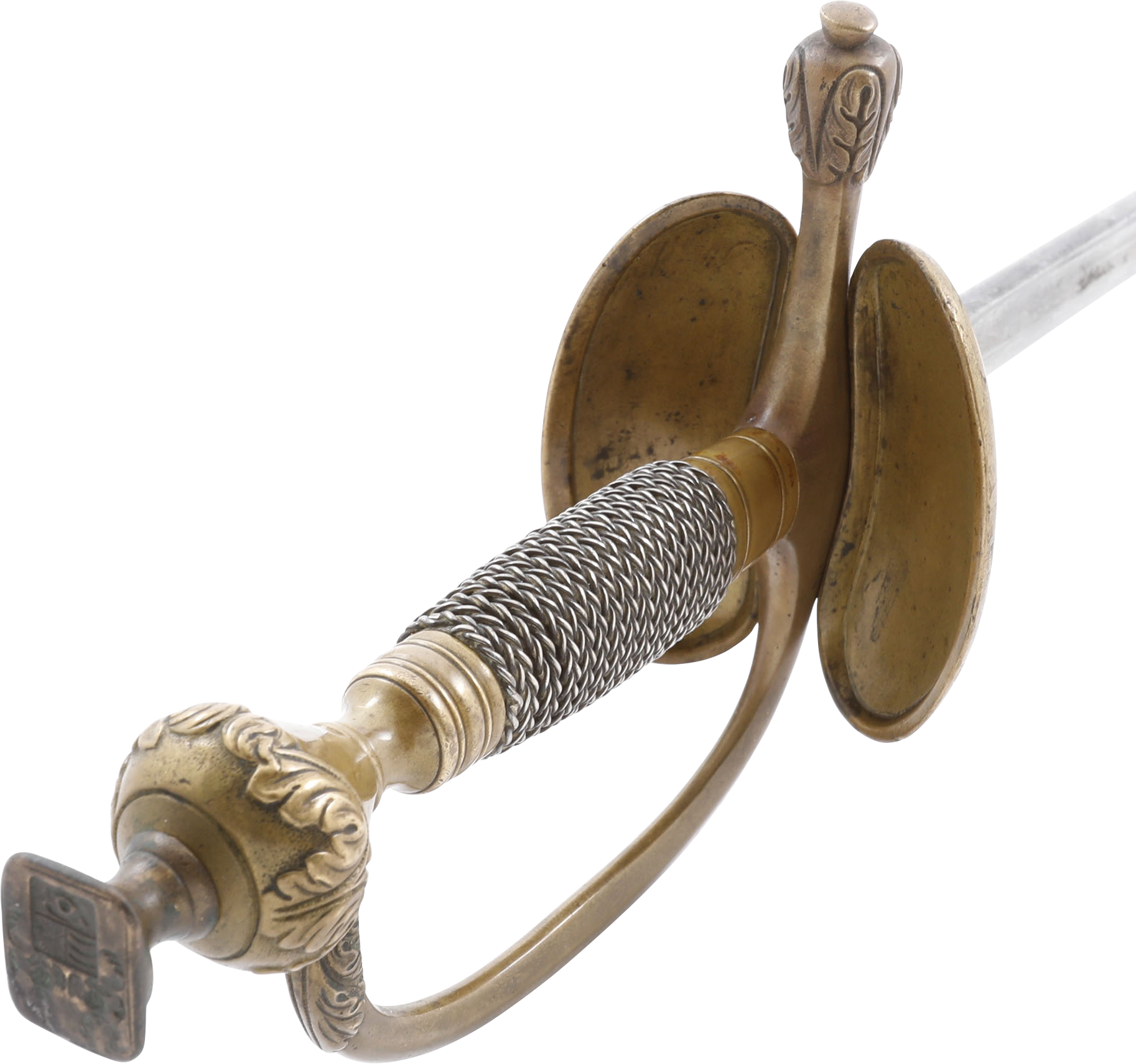 Late 19th-century. Standard pattern. Brass hilt with double raised edge shell guards and silver wire wrapped grip, sound and tight. Standard pommel topped with an integral rectangle crisply impressed with a quartered armorial device with star burst, crescents and a further unidentified figure. Darkened and perhaps plated originally. The field below with rococo volutes. 31 1/4” broad fullered single edged blade, finely decorated half its length with scrolling foliage, excellent. Brass mounted black leather scabbard, slightly shrunk from age but otherwise excellent.