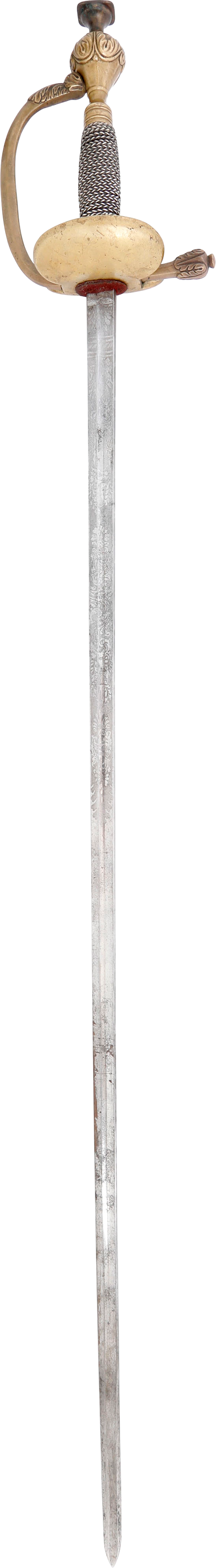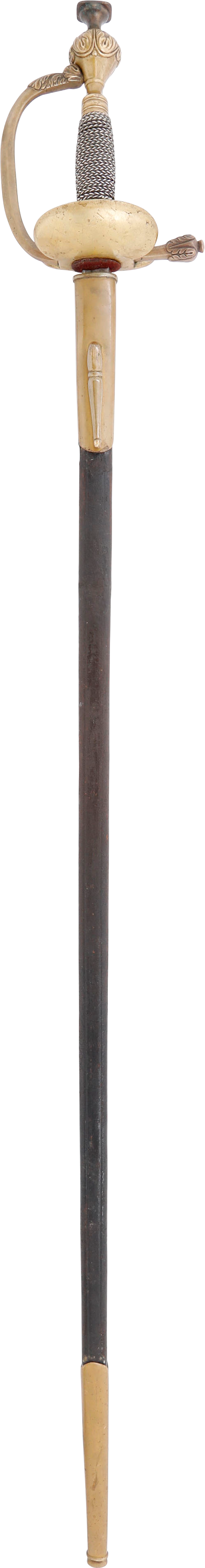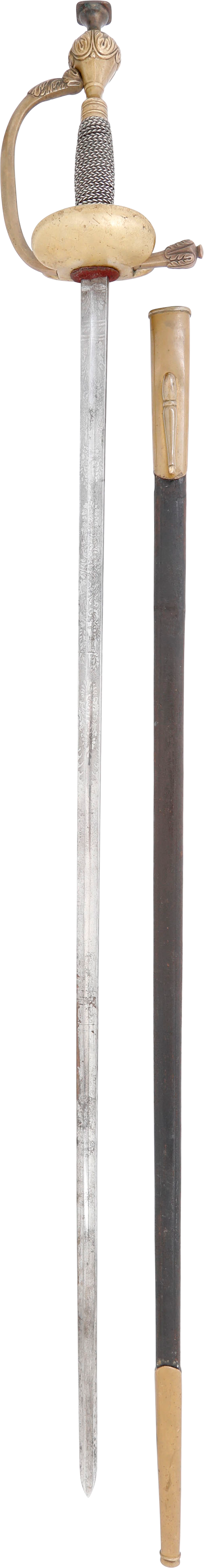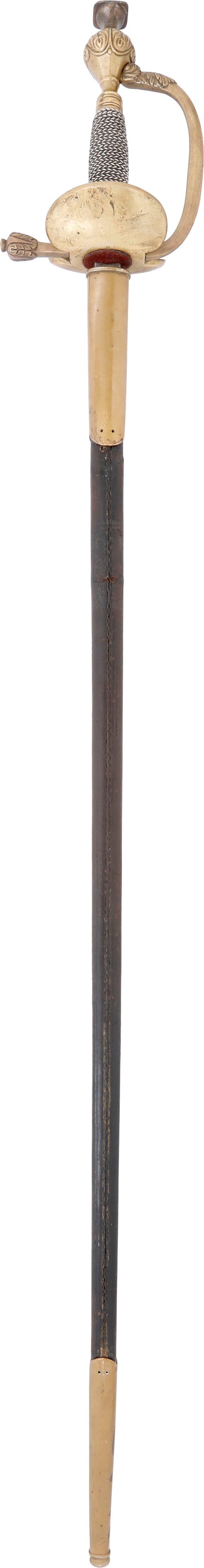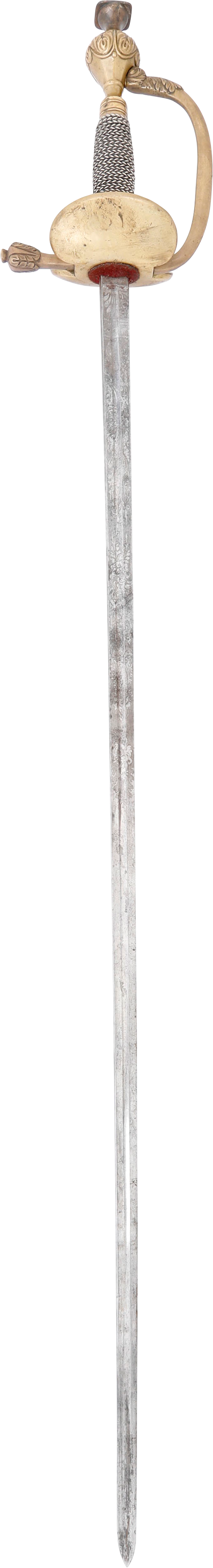 Late 19th-century. Standard pattern. Brass hilt with double raised edge shell guards and silver wire wrapped grip, sound and tight. Standard pommel topped with an integral rectangle crisply impressed with a quartered armorial device with star burst, crescents and a further unidentified figure. Darkened and perhaps plated originally. The field below with rococo volutes. 31 1/4” broad fullered single edged blade, finely decorated half its length with scrolling foliage, excellent. Brass mounted black leather scabbard, slightly shrunk from age but otherwise excellent.