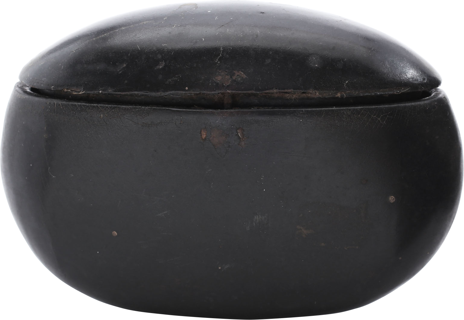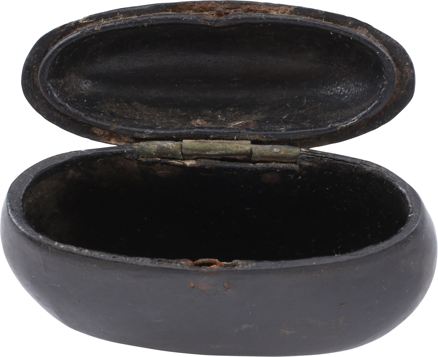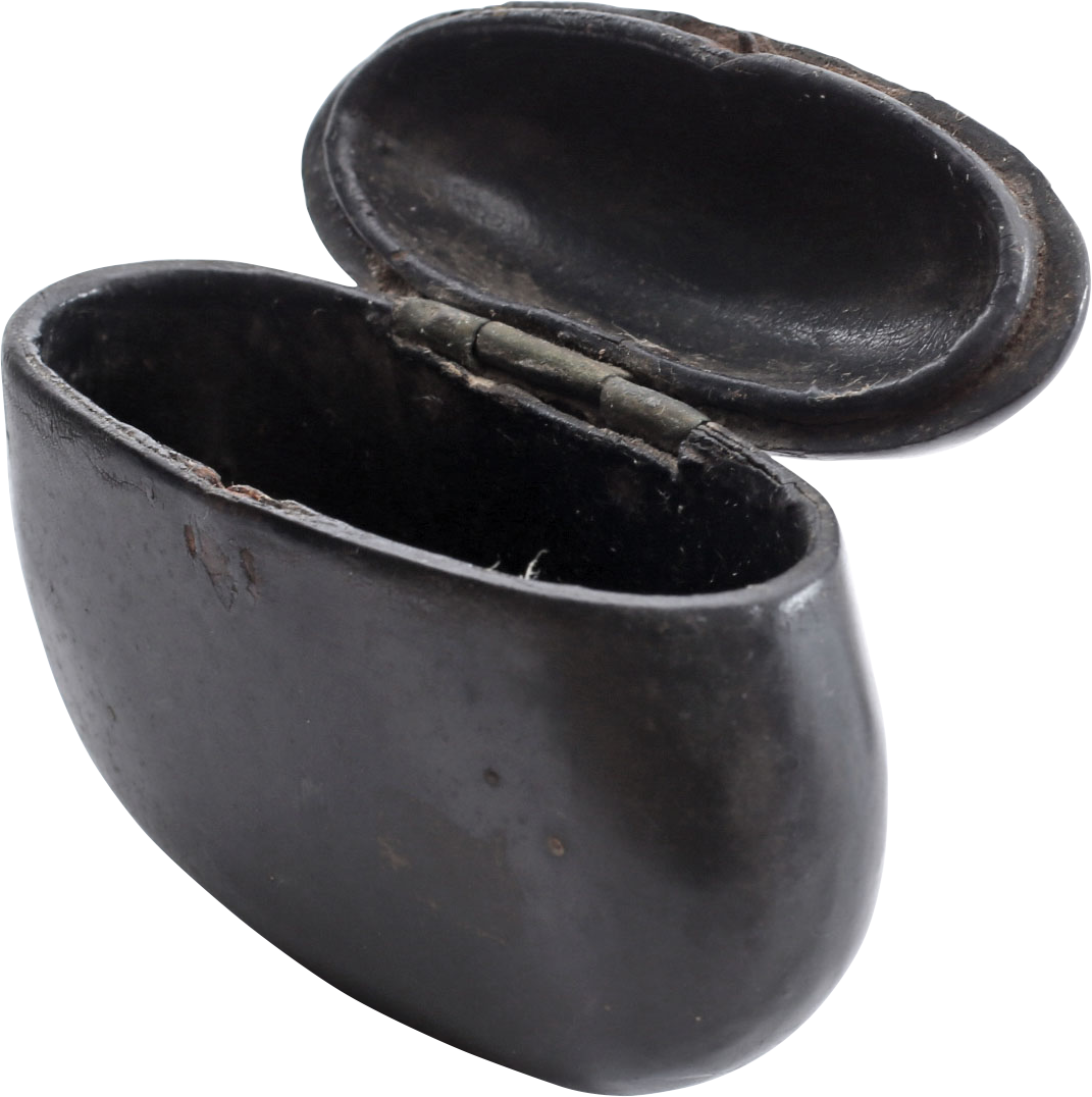 Black japanned papier mache, oval, 3 ¼” width with hinged back. Shaped to fit into a gentleman’s vest pocket. See Collector’s Encyclopedia of the American Revolution, Neumann, p.246 #3, for identical. Expected wear.