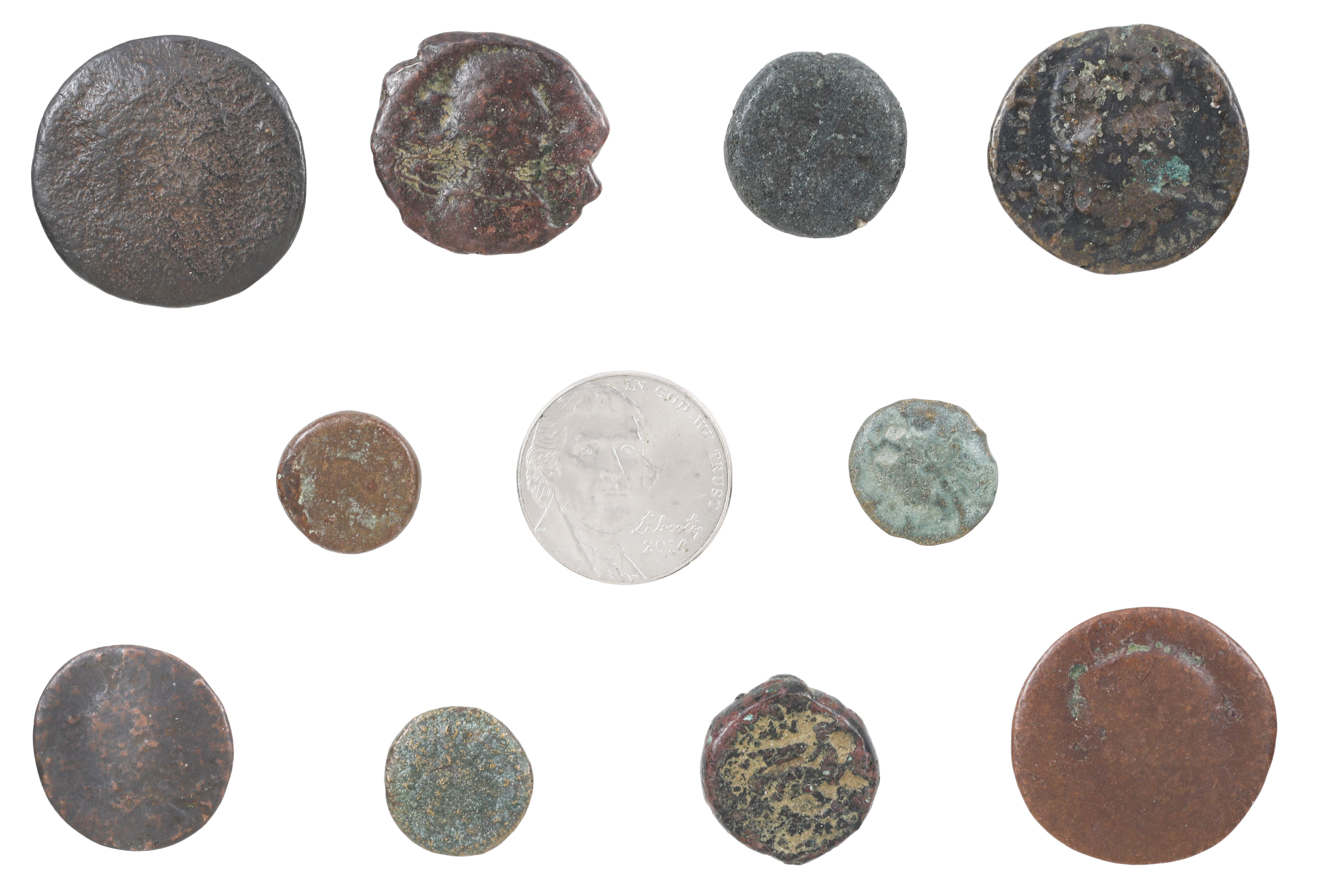 First to Tenth century AD. Ten coins. Worn, but great to stimulate young minds. Collection of the ten pieces shown, in a drawstring gift bag. Shown with a modern US nickel for scale.