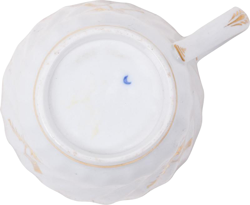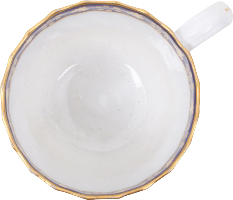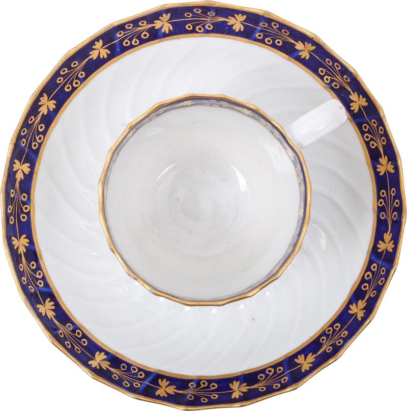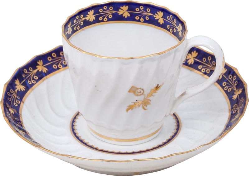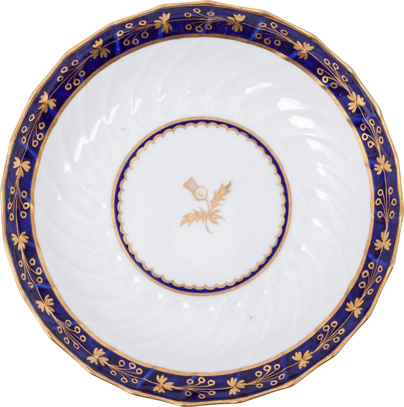Scottish reconciliation period, two generations after Culloden when the Scottish rebels were broken and Scottish royalists tolerated at length. The pressures of war with America and France (with Spain waiting in the wings) demanded that England, with her Hanover king, enlist every resource. Despite their defeat, the voracity of the Scots was universally acknowledged and their military support eagerly courted. The display of the thistle, an icon of Scottish pride, was forbidden by law before 1782, during which this set was produced. Yet, politics dictated that it be allowed, and Scottish pride, insisted that it be displayed against the law which called for imprisonment for such a display, and merely a few years earlier, would have been fully enforced. The body of both pieces of shanked (spirally fluted) form with scalloped edges. Both decorated with gold on cobalt underglaze with primary thistle motif. Both with the Dr. Wall crescent mark underglaze. Both in fine preservation with the gold intact including the vulnerable scalloped edges. The quality is clearly indicative of one of the aristocratic Scottish clans.
