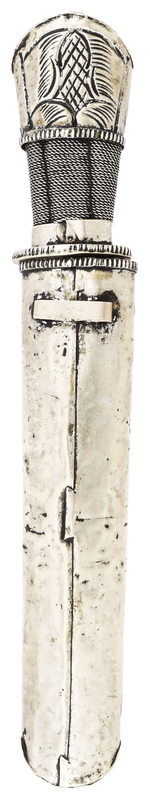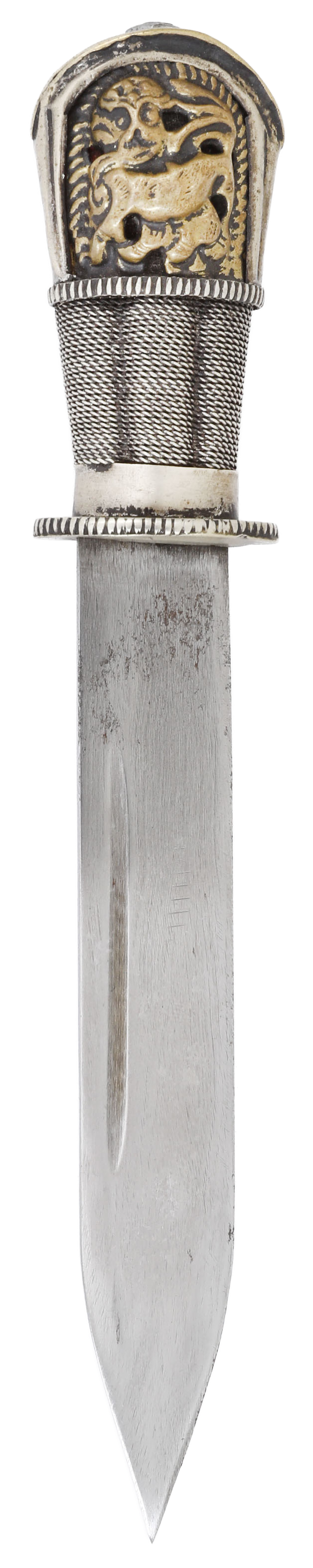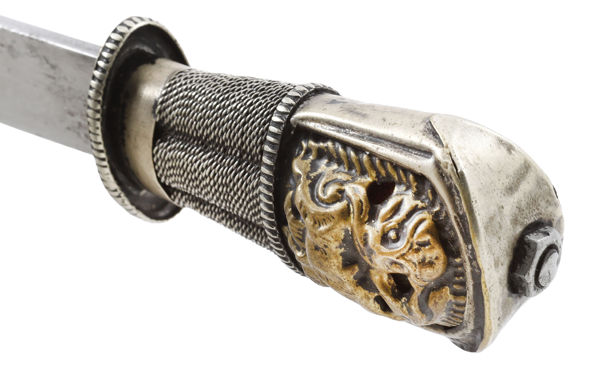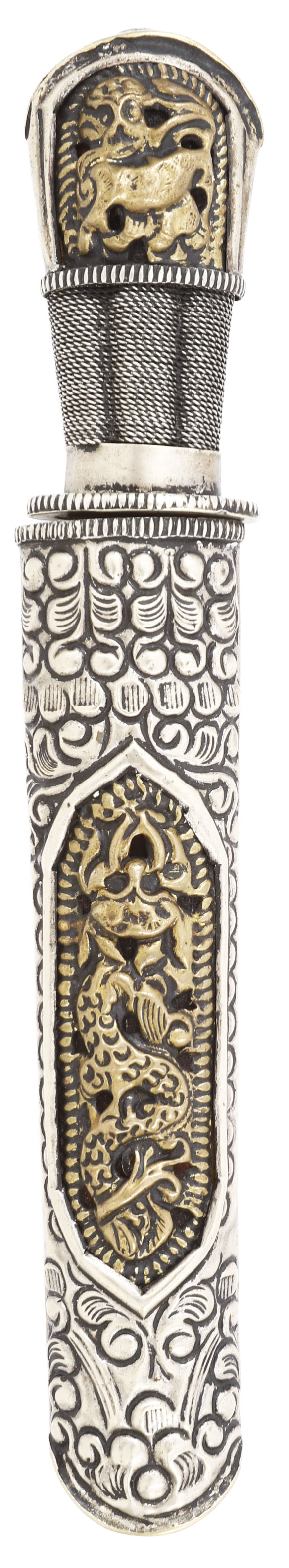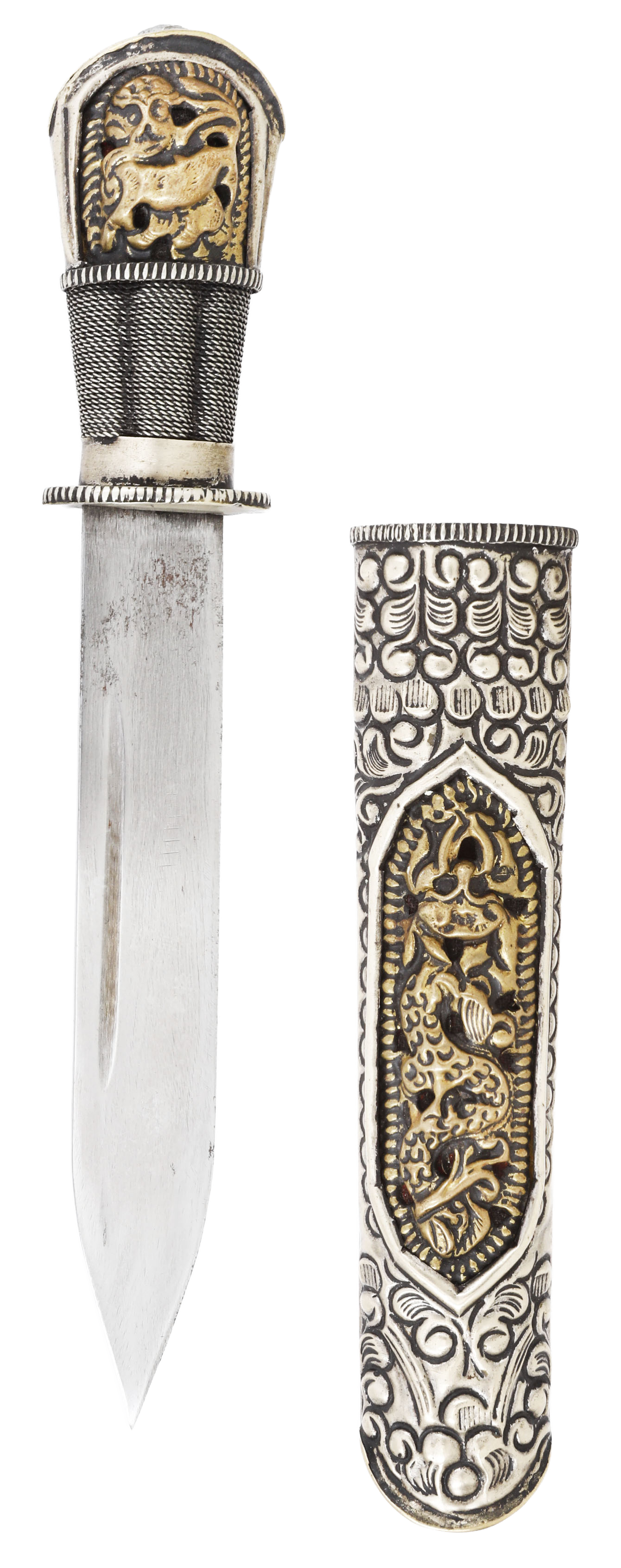 White metal hilt and scabbard. The pommel inset with high relief roped bordered dragon. Finely fluted wire wrapped grip. The scabbard relief embossed in Buddhist clouds with roped bordered inset panel of a serpentine Buddhist dragon. Hilt and scabbard complete with minor blemishes only. 5 1/2” spear point blade of wedge section with narrow back fuller, bright finish remaining.