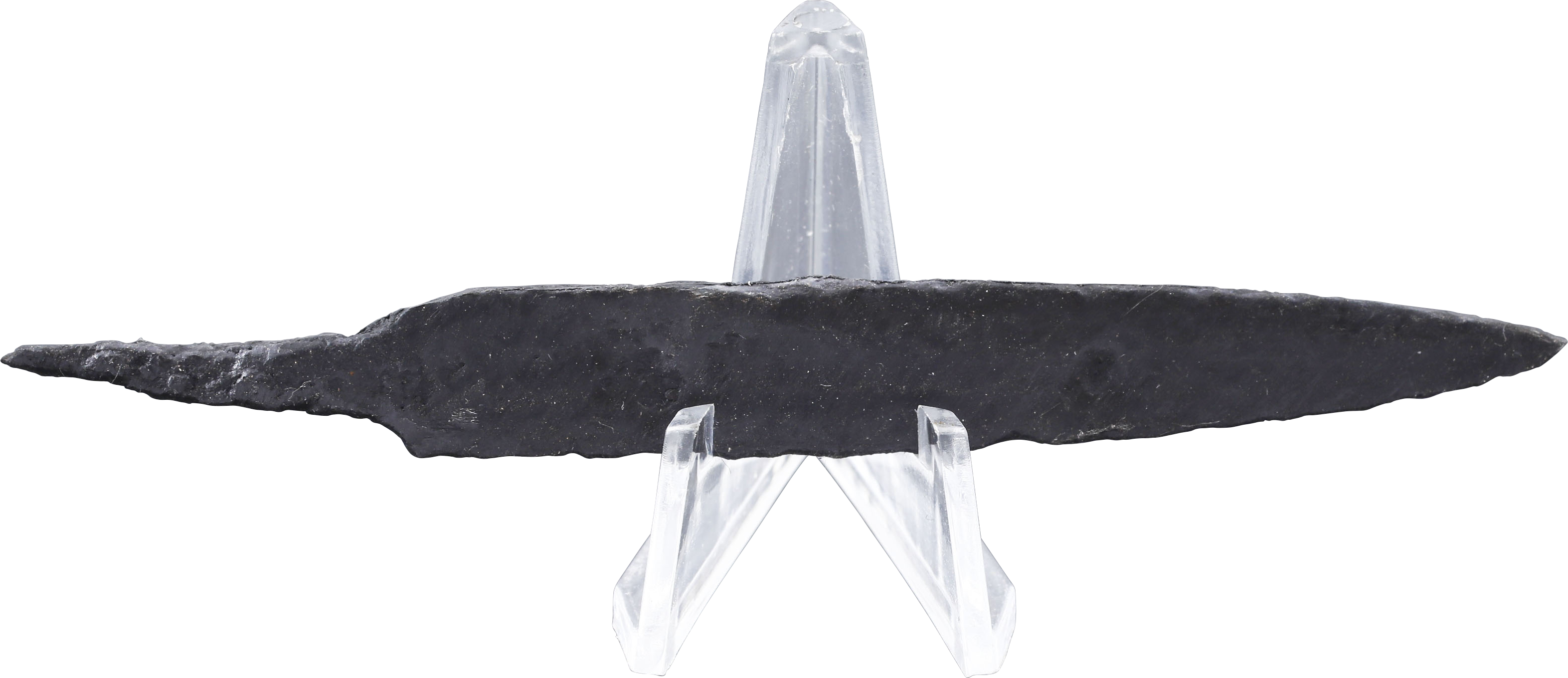 About 4” (3.92”) total length. Wedge section blade for slashing with a slightly dropped point in the scramseax style for thrusting. Whittle tang, to secure it to the wood, bone, or antler grip, now perished. (See Leather Working Reverend and Inhabitat for similar examples with original grips). Stable oxidation with a good profile, as typical for water, finds. These side or pouch knives were among the most treasured possessions for Vikings, rather than the large seax with which they were buried. They likely had spiritual significance to the owner during his life. A fine weapon, suitable for throat slashing as well as organ depth thrusting attacks. Excavated and professionally conserved with Plexiglas display easel and Certificate of Authenticity.