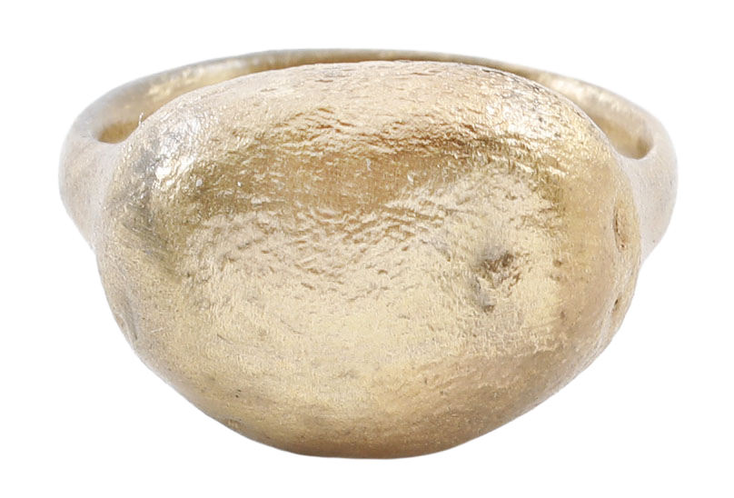 Gilt bronze, size 8 with 2.3 deeply rounded band flared to the shoulders. Raised oval shaped bezel of high domed section. Surface textured from burial. Professionally refurbished with the 24karat gold overlay restored. Gift boxed with a certificate of authenticity.