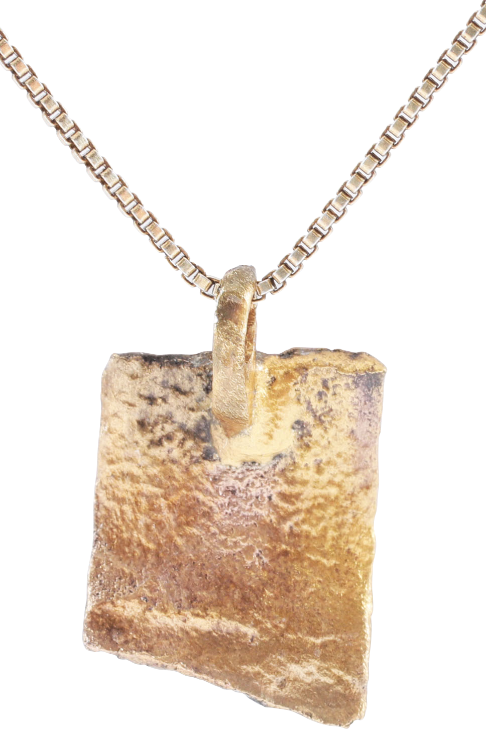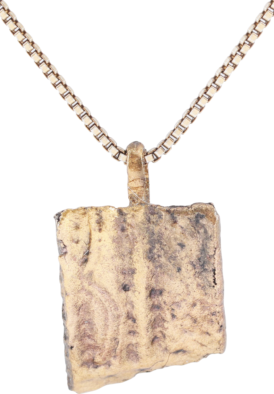Vikings were highly skilled metallurgists, and as a result, breaking metal had supernatural significance for them. Breaking ringjarn (iron rings) as shown on the Larbro Stone, was thought to destroy the spirits of enemies. Similarly, Viking weapons and accouterments were broken for burial with their owners. This is the broken end of a fine Viking woman warrior's bronze bracelet. It is about 1/2” x 1/2”. It was hand-decorated by a Viking craftsman, 1000 years ago! It is line bordered with a medial separating panels of curvilinear  and stipple band forms. Professionally refurbished with a 24karat gold overlay restored and mounted to an 18” gilt Sterling silver neck chain for modern wear. It comes with a certification of authenticity, and jewelry gift boxed. Nice crisp example.