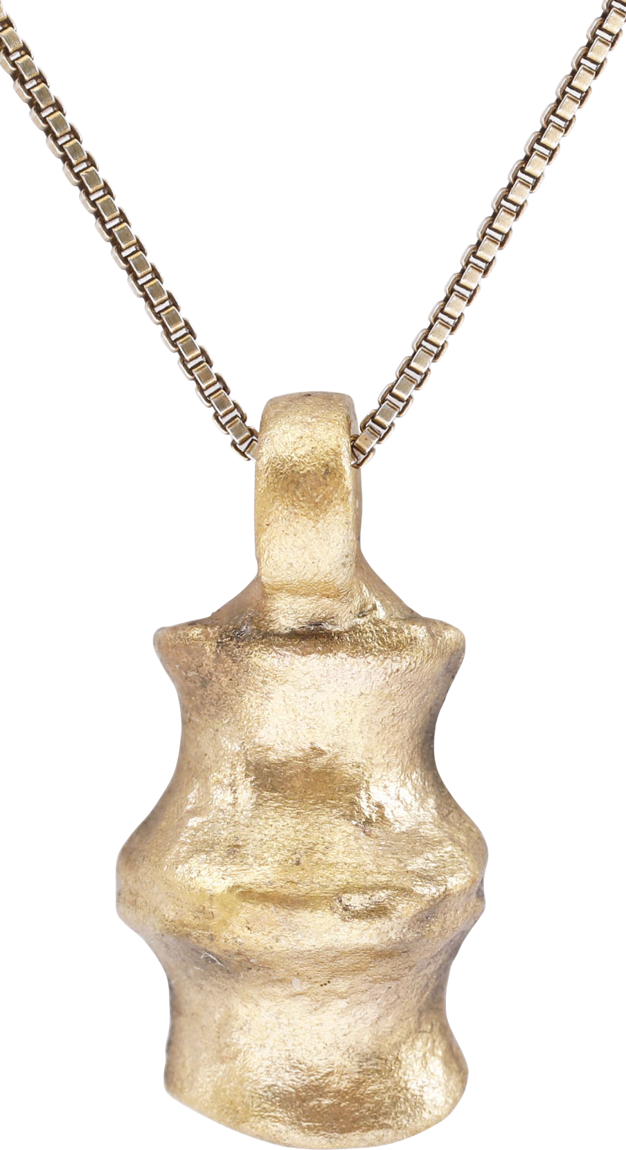 This is an original belt mount from a Roman legionary’s sword belt, mid 2nd-mid 3rd century AD. See Forum Ancient Coins for virtually identical examples and detailed information. As well as decorative, these mounts were, capable of protectively absorbing the impact of a sword blow. Thus, they are in fact, a form of Roman armor. This example has seen considerable service and was buried for 1500 years. It is bronze about 5/8” (0.60”) height plus the suspension ring. It is double waisted with swelled medial and ends. The 24karat gold surface is restored and mounted on an 18” gilt silver mounted polished leather neck cord for modern wear. Gift boxed with certificate of authenticity.