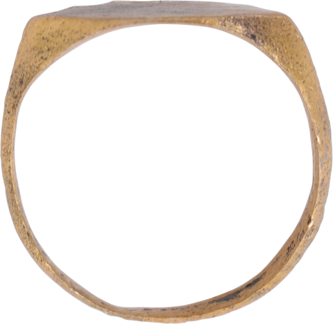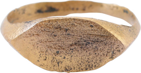 Size 7 ½.  2.6mm ridged band flaring to the lenticular bezel which is cut with a pattern, now obscured by wear and burial, serving as a signet, which identified the owner and could be used to seal legal matters. (In Ben Hur, the title character identifies himself by stamping Messala’s tablet with his ring which bears the signet of Quintus Arrius.) Professionally refurbished with the 24karat gold surface restored for contemporary wear. Jewelry gift box with Certificate of Authenticity. Good wearable size.