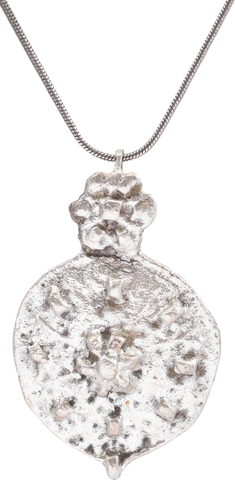 Large compound example undoubtedly specifically related to the Cult of Fortuna. Silvered bronze as a wheel with eight raised spokes. The hub is a six spoke wheel with raised hub and above it an identical wheel. The worship of Fortuna, daughter of Jupiter, endured the conversion from paganism to Christianity with the symbol of the wheel used variously including in cathedral windows. In the late Roman period, amulets dedicated to Fortuna were common but the complexity of this example suggests active worship of the goddess. Temples and shrines devoted to Fortuna proliferated in the ancient Roman empire and the craftsmanship of this amulet suggests a provincial origin. Surface textured from burial and restored in pure silver. Mounted with an 18” sterling silver neck chain for modern wear. Gift boxed with certificate of authenticity.