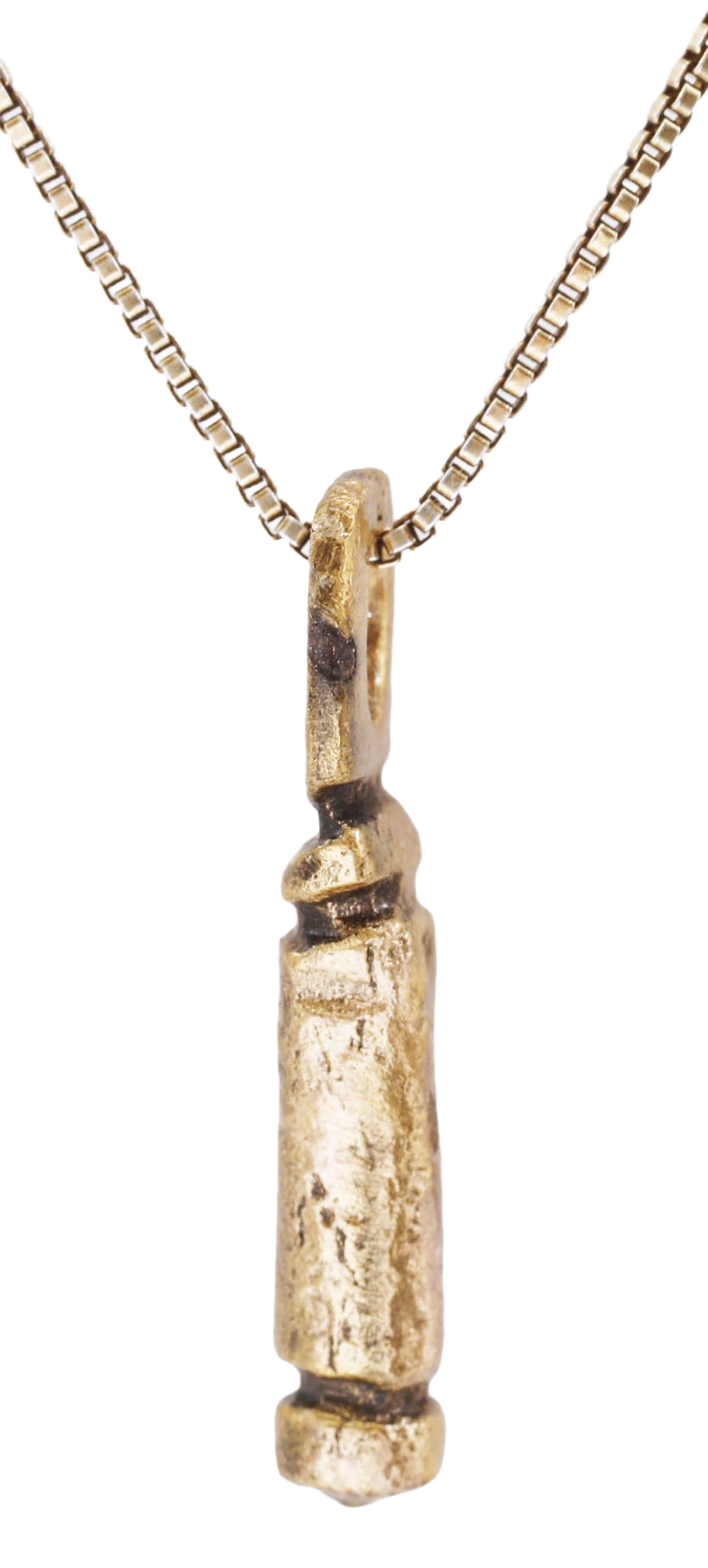 Roman women wore necklaces with small pendants symbolizing many things from fruit and sea shells to erotic subjects. This example is slightly tapered it bulbous ends, with significance now lost. It is about 5/8” height plus the suspension ring. The 24karat gold surface has been restored and it is suspended from an 18” gilt silver neck chain. Gift boxed with certificate of authenticity.