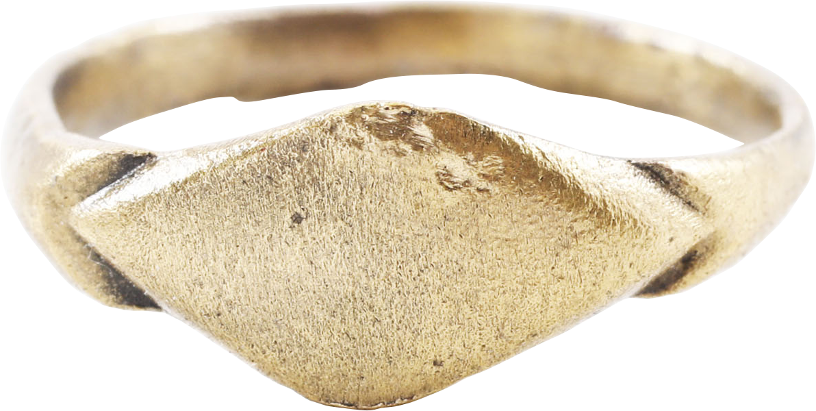 Flemish or Dutch. Gilt bronze, size 9 3/4 with a narrow band and central diamond flanked by chevron motifs. Light surface texture from burial. Professionally refurbished with the 24karat gold surface restored and jewelry gift box with a certificate of authenticity. Good wearable size.