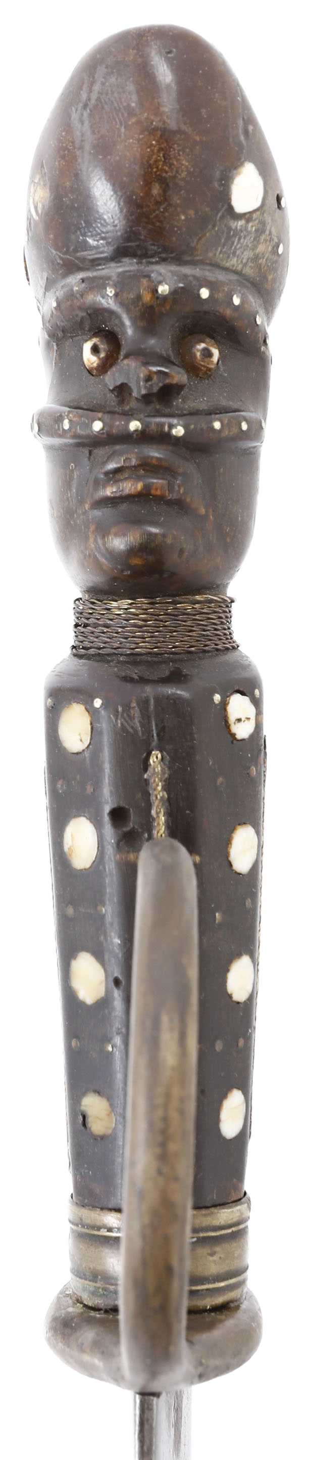 18th century Genoa was a hotbed of violence and intrigue. It was a city-state republic controlled by several powerful families who fought for control after the failed Austrian siege of 1747 which led to the loss of Corsica in 1768. Power was traded through secret agreements and alliances and preserved through fear, brutality, and assassinations. As assassinations stemmed from power struggles, an element of brutality to instill fear in surviving opposition was utilized. This is the sword of a henchman whose job it was to deliver those elements and carry out assassinations. It has a 22 3/4” cutlass from the blade which derives from Genoa’s maritime culture. In fact, short swords were favored throughout the Italian peninsula. The horn grip is carved as a Moor, with the head fully modeled and decorated in bone and brass piques. The guard is shaped to embrace the first two fingers for better purchase, like a thumb ring, and only partially defensive. See il coltello Genovese storie de lame di armi proibite di caruggi, (the Genoese knife stories of blades of forbidden weapons of “alleyways”), Andrea Buti, p.363 for another example.