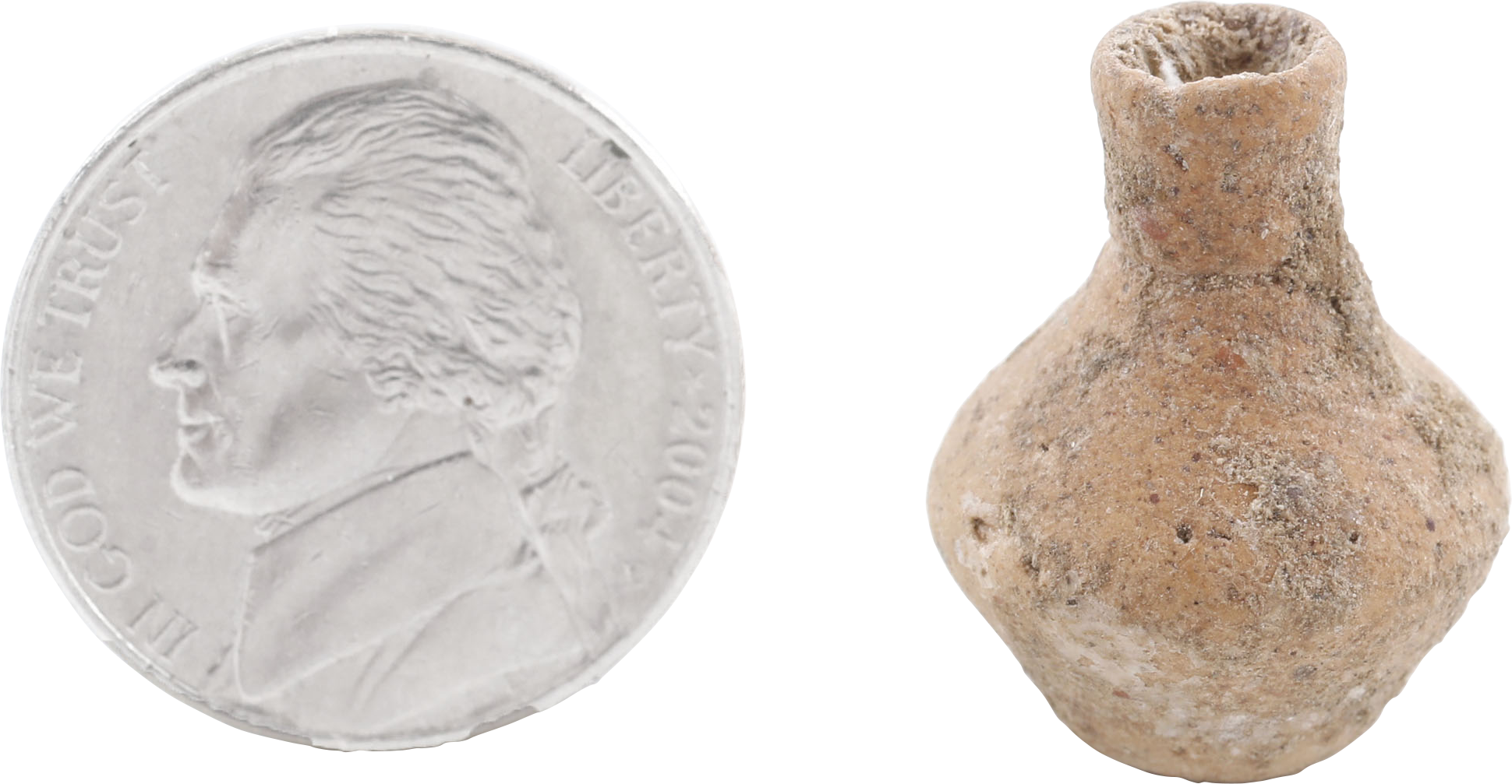 Miniature size, shown with an American nickel for scale.  Interred with the deceased for service in the afterlife. Angular jug with flat base cylindrical spout with thickened lip showing Greek influence. Wheel turned with the body hollowed. 22.2mm, 0.88” height.