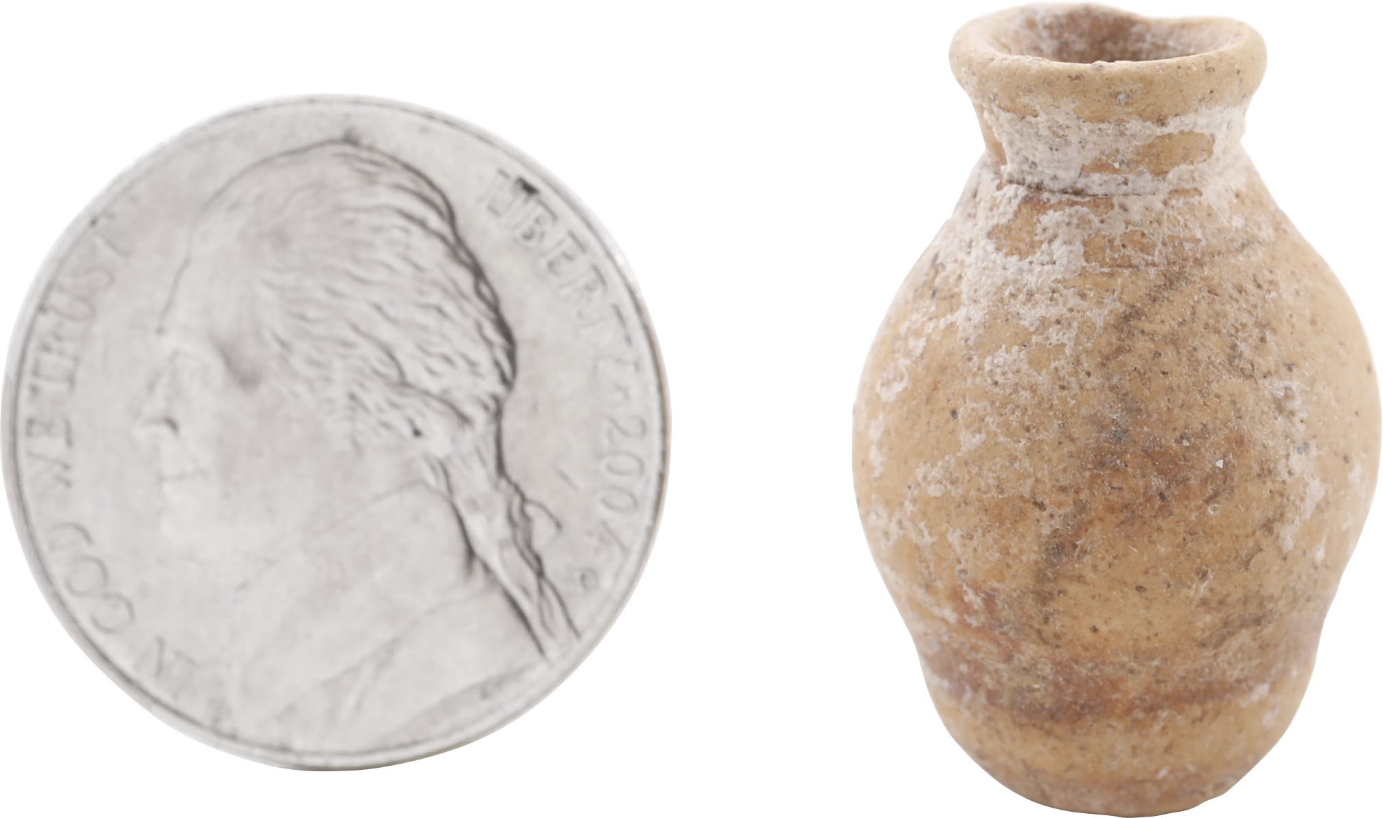 Miniature size, shown with an American nickel for scale. Interred with the deceased for service in the afterlife. Angular jug with round base and flared spout, showing Greek influence. Wheel turned with the body hollowed. 24.2mm, 0.95” height.
