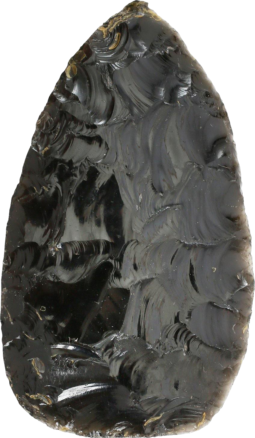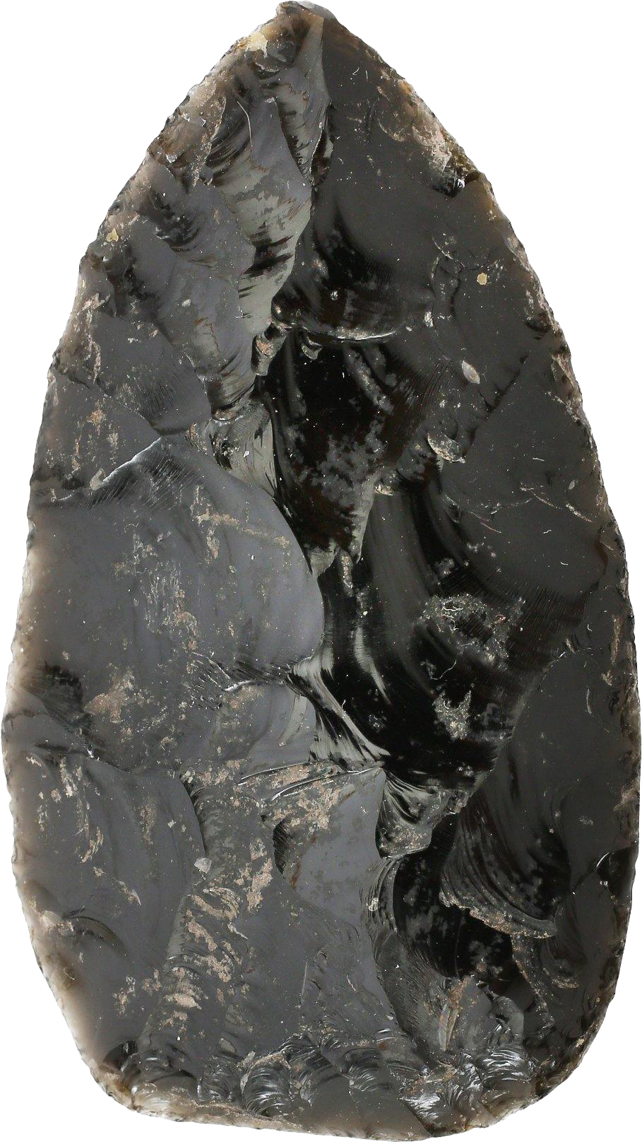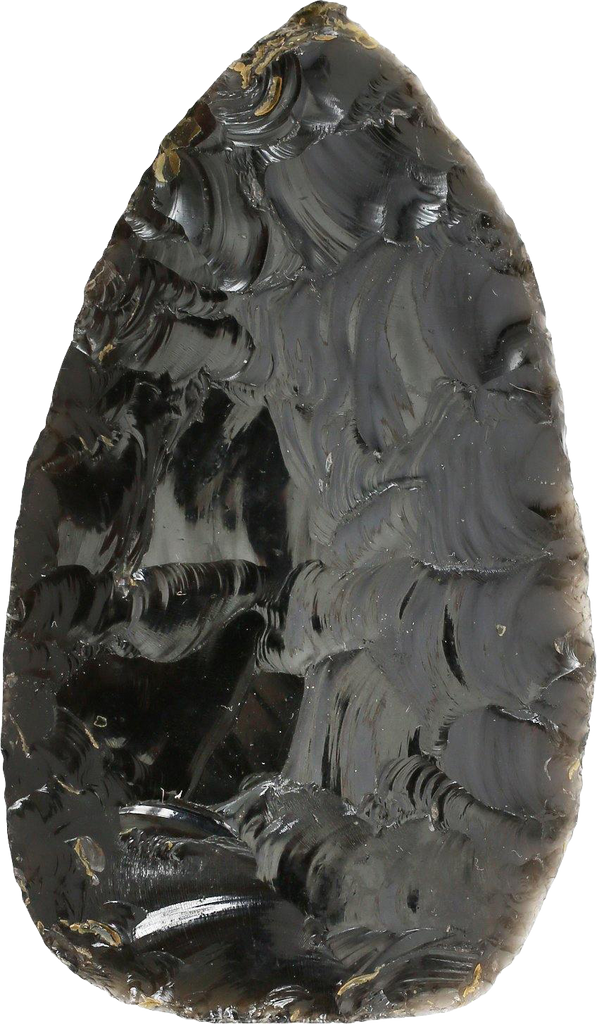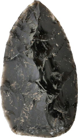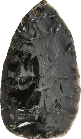 Valley of Mexico, probably Teotihuacan, C.800 BC-800 AD. Slightly over 3” in length, broadleaf form, fully flaked on both sides, and of good fully rounded section. Which worked well with traces of soil adherence from burial. The Valley of Mexico which includes modern Mexico City is surrounded by volcanic mountains, the issue of which formed the obsidian from which these weapons were produced.