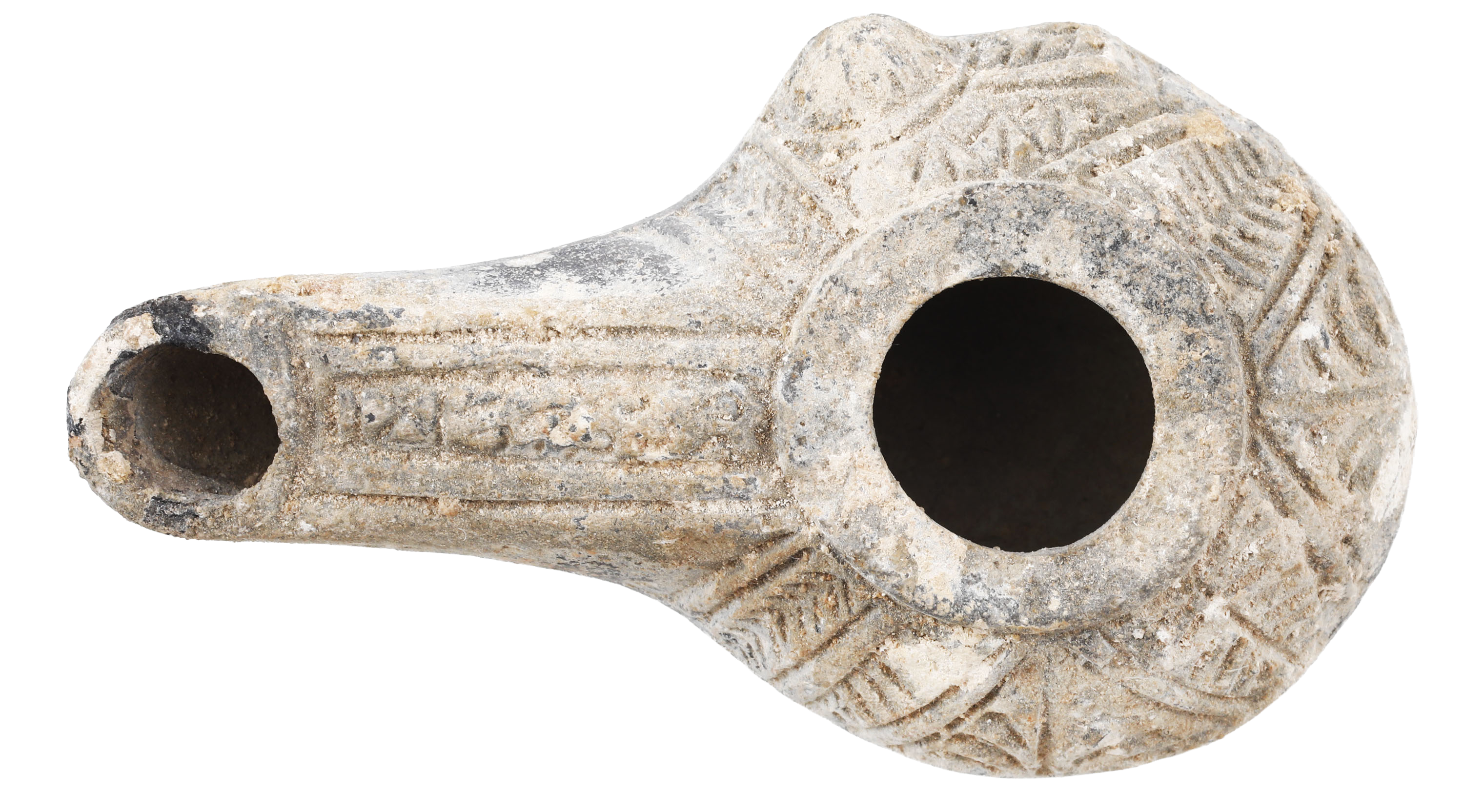 Scarce iconic evolutionary form. 3 ¾” length, buff terra cotta, hand formed and decorated. Circular with two part side lug and long spout. Some flaking to the underside. Jerusalem dealers stamp to the bottom.