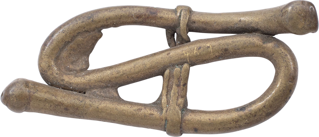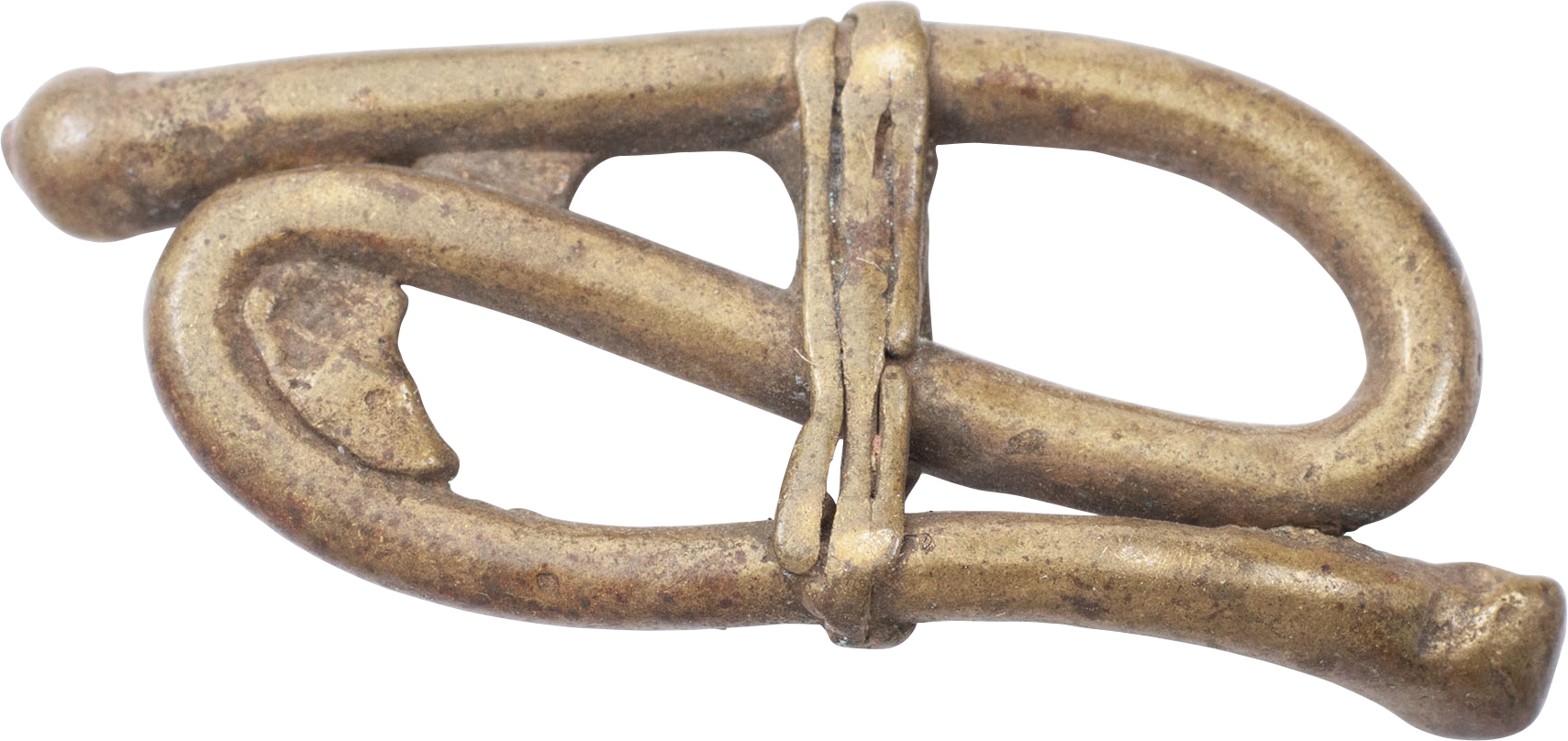 Figural form illustrating a proverb. A tubular element is folded on itself and bound in the middle with a band. A variation on a common theme with these emphasizing that while we all have individual wants and needs, we have a common element in our humanism (sometimes characterized as a common stomach). From the Sir Cecil Armitage Collection.