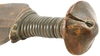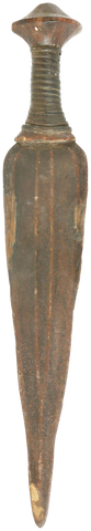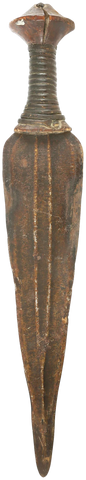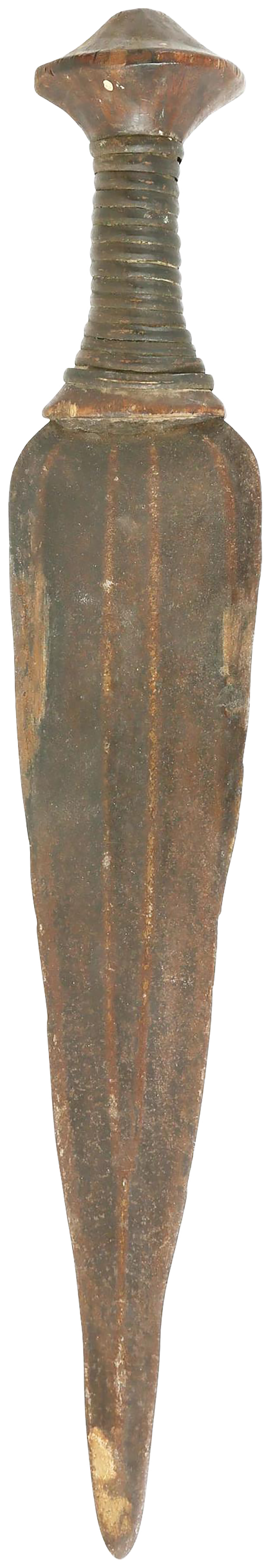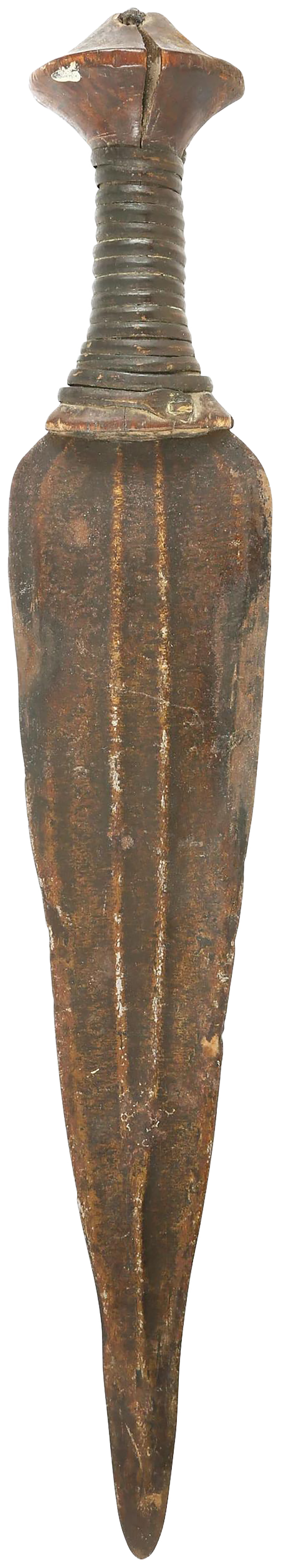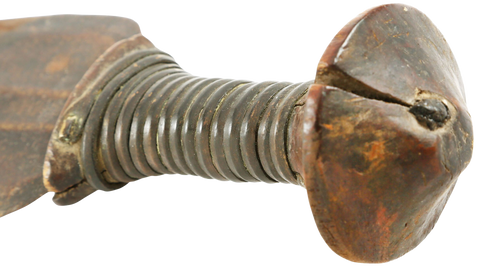 From the Baptist Missionary Society Collection. Second half of the 19th century when the slave trade was primarily for the Arab market and human consumption (cannibalism). That last, flesh for human consumption, had largely been ignored but for a few accounts like Glave. Recent anthropological studies assisted by the wealth of information compiled on the internet attribute a much greater proportion of the slave harvest to the cannibalism market. This example of characteristic form with 13” blade with ridges flanking the center and iron trade tape wrapped wood grip. Well used and with original preservative on the blade. The Baptist Missionary Society collection was collected by Missionaries and traveled to churches in England for “Mission Sunday” fund raising. The practice was discontinued in the 1930’s and the collection sold about 1980 at Christies London..