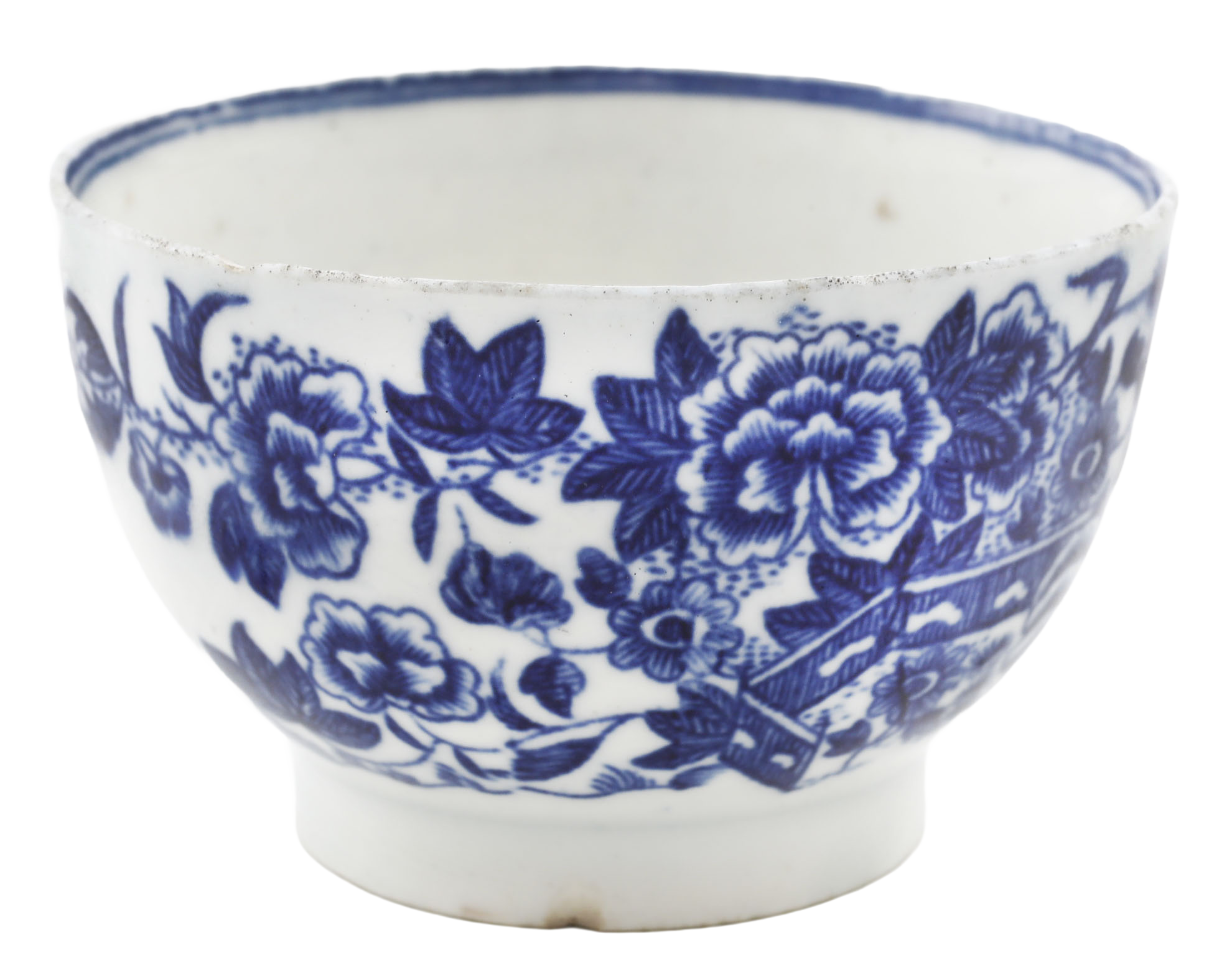 First Period (Dr Wall Period) 2 5/8” diameter, blue on white decorated with the “fence pattern”. Blue crescent mark underglaze to the bottom. At the time, tea was very expensive and kept under lock and key. It was consumed as a luxury in small quantities served in these diminutive bowls or cups. Tiny flake to the foot otherwise excellent.