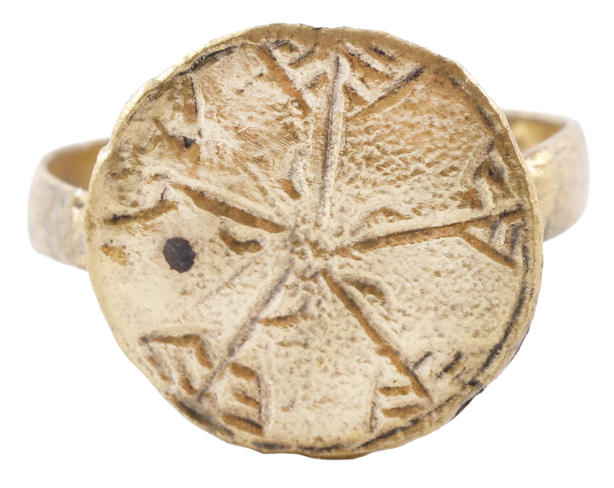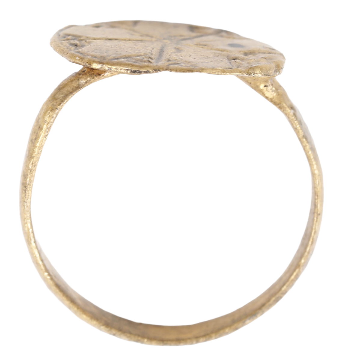 Gilt bronze, size 10. 3.8mm rounded face band. Raised circular bezel with five radials representing the five wounds of Christ. Each with triangular terminal and comprising a variant of the Chi Rho Christogram. See Ancient Rings, Pollio, p.87. Professionally refurbished with the 24karat gold surface restored. Gift boxed with certificate of authenticity.