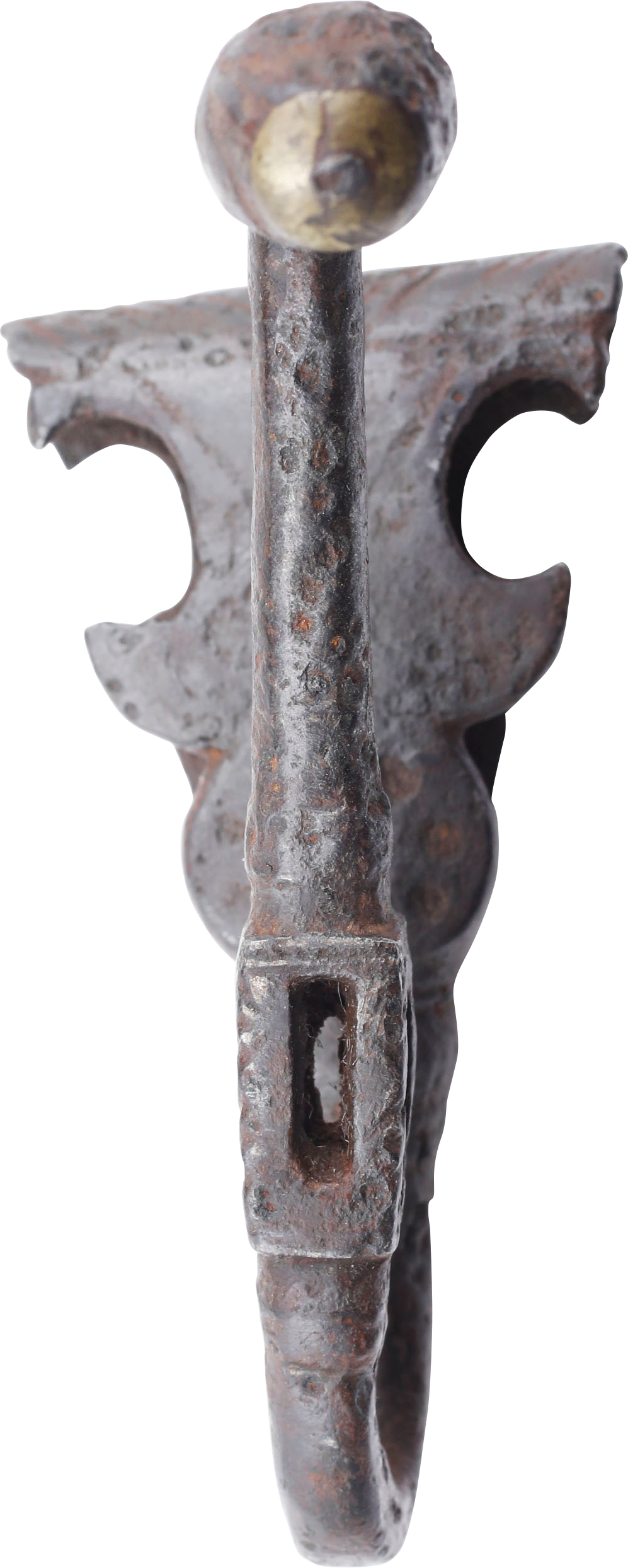 Forged iron, 3 3/8” length. Triangular loop with crescent form scallops. Tapered hook with pierced rectangular medial which engaged the scabbard suspension ring. Brass capped acorn terminal. See Metropolitan Museum 2010.180.2, online and displayed in Gallery 307, for a near identical example identified as French, 15th century. The quality suggests the accessory served a knight, probably noble, suspending a sword such as our A5986.