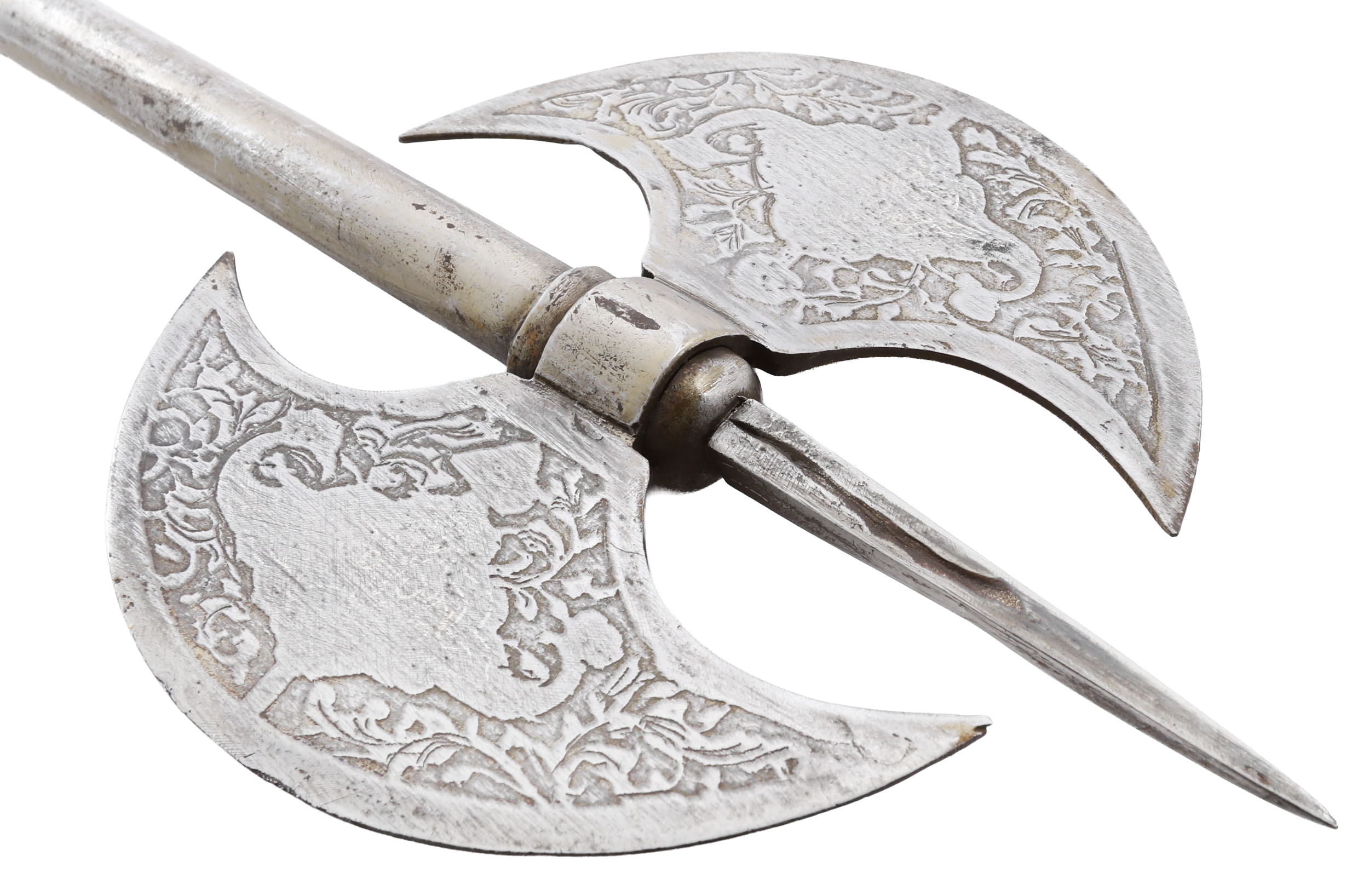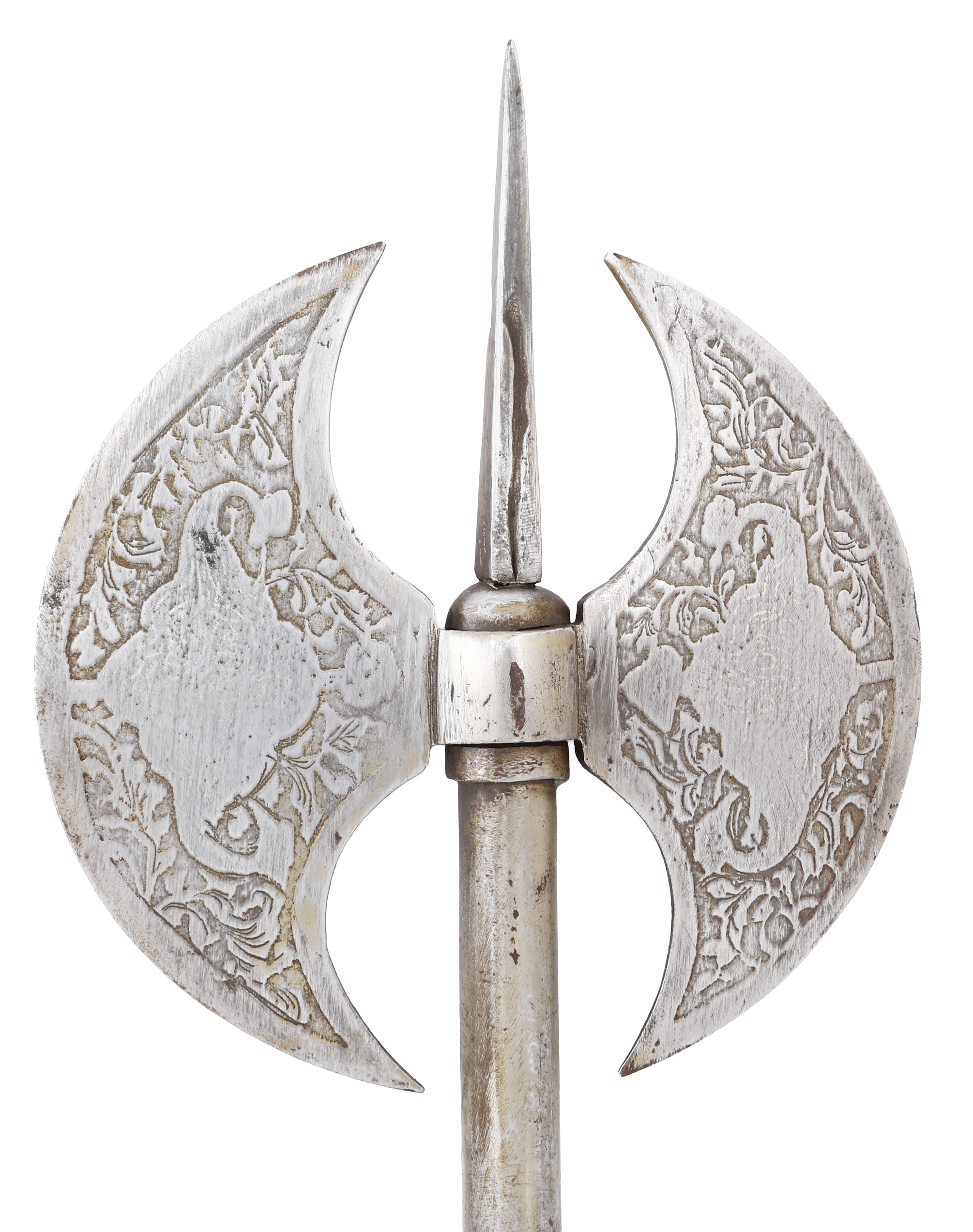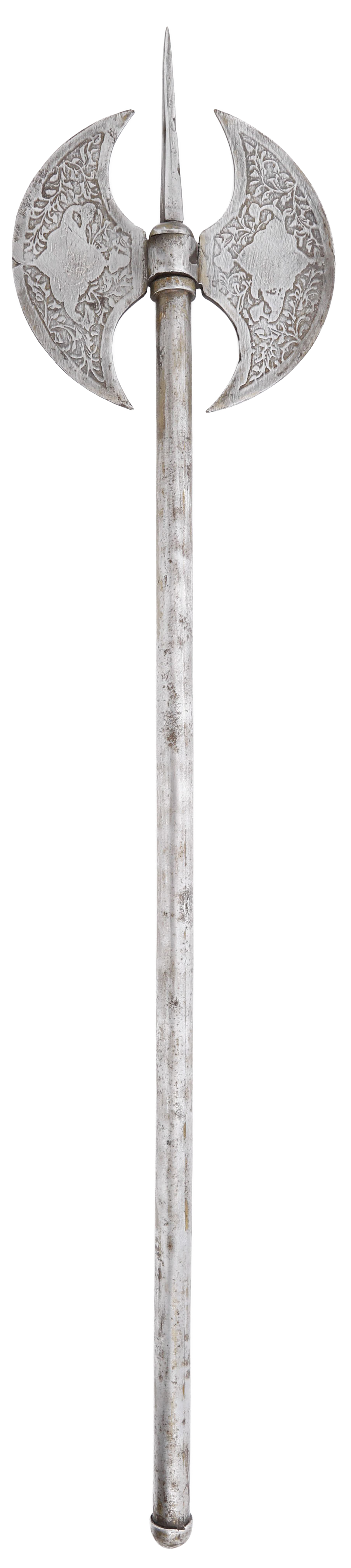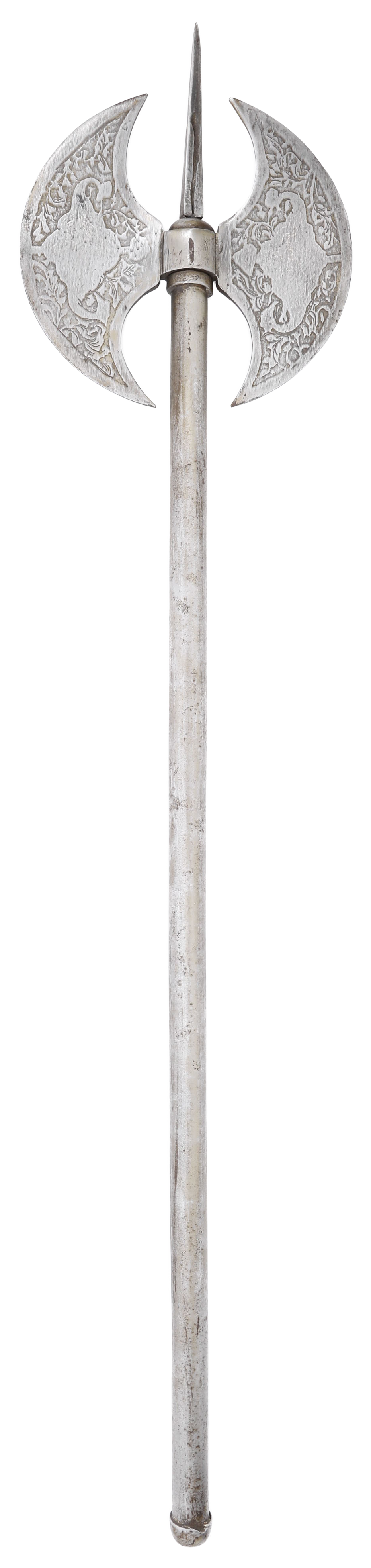 19th century. 25 1/4” length. Addorsed crescent bits decorated in foliage panels with central cartouches with remnants of silver decoration. Diamond fore spike showing forged lamination flaws. Tubular haft, undented, with mushroom form terminal. Well preserved and fine display.