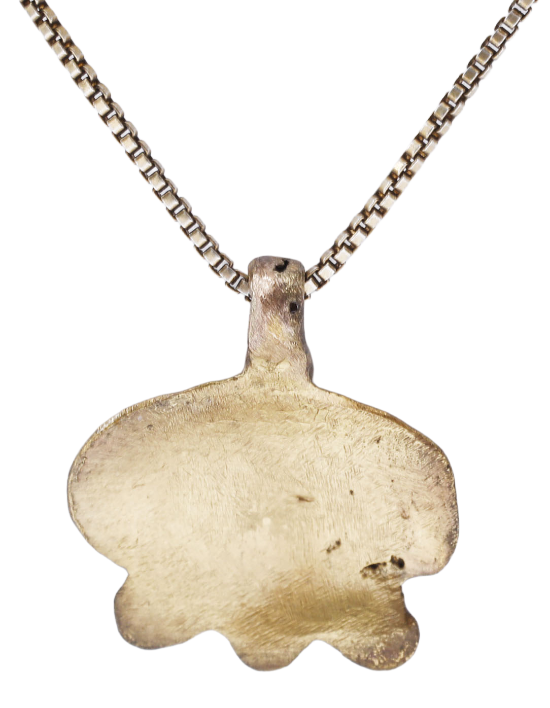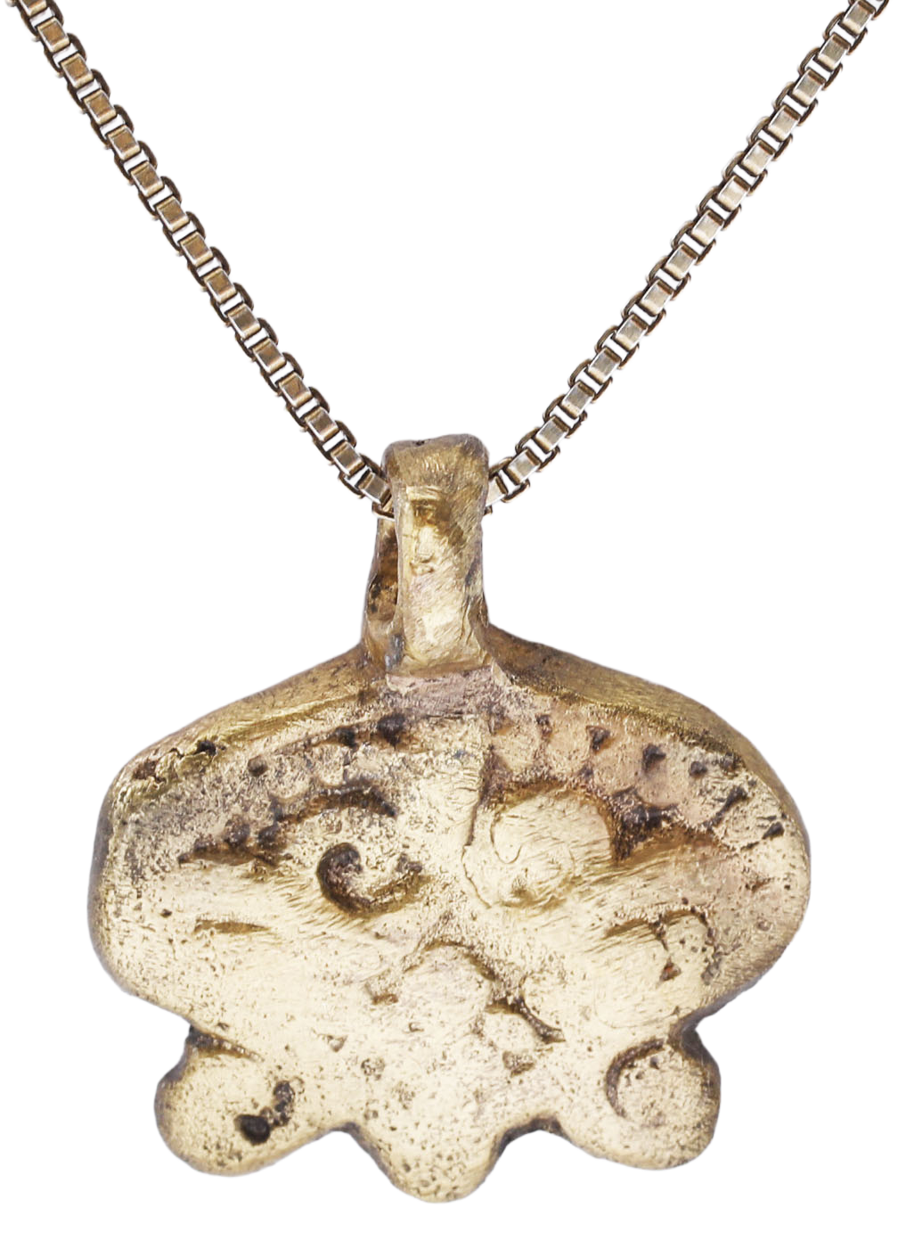 Gilt bronze, 5/8” (0.63”) width, based on the earlier Viking heart amulets. Rounded top with pointe bottom, crenulated upper border and fleur-de-lys in the field. The lower quarters nubbed in the Viking taste. Clearly a throw back to the pagan era. Christianity was established but earlier mythologies were respected and blended, as are superstitions, today. Professionally refurbished with 24karat gold surface restored on an 18” gilt silver neck chain for modern wear. Gift boxed with certificate of authenticity.