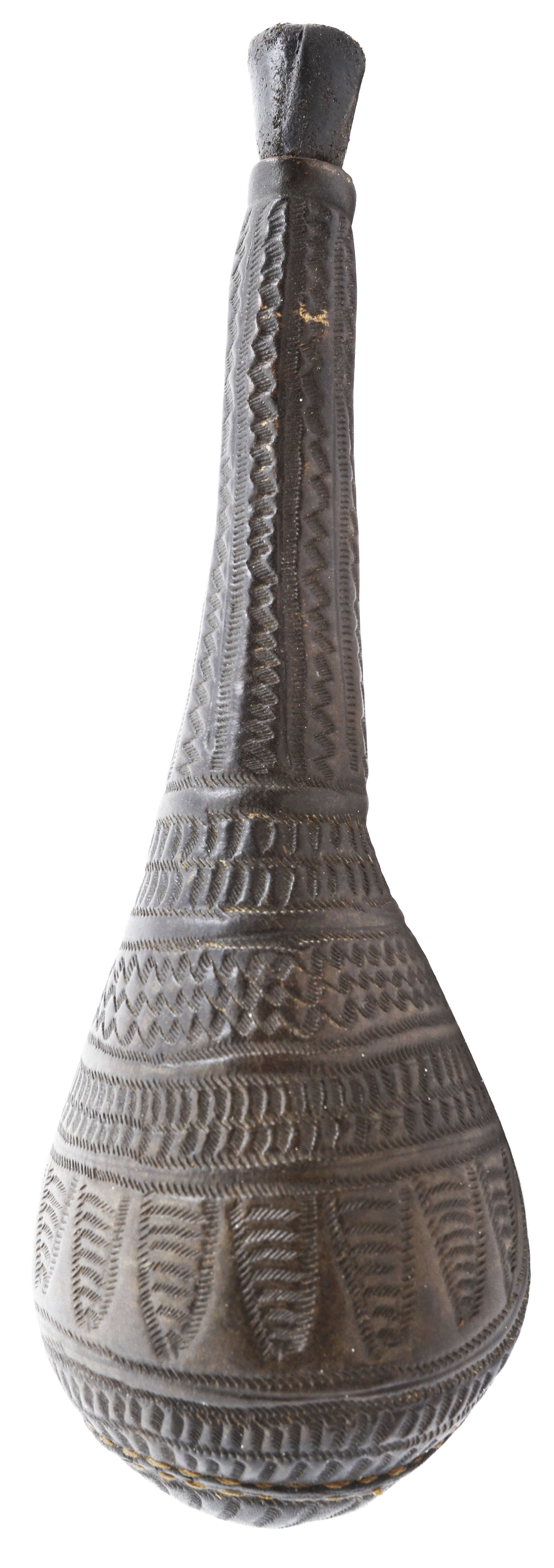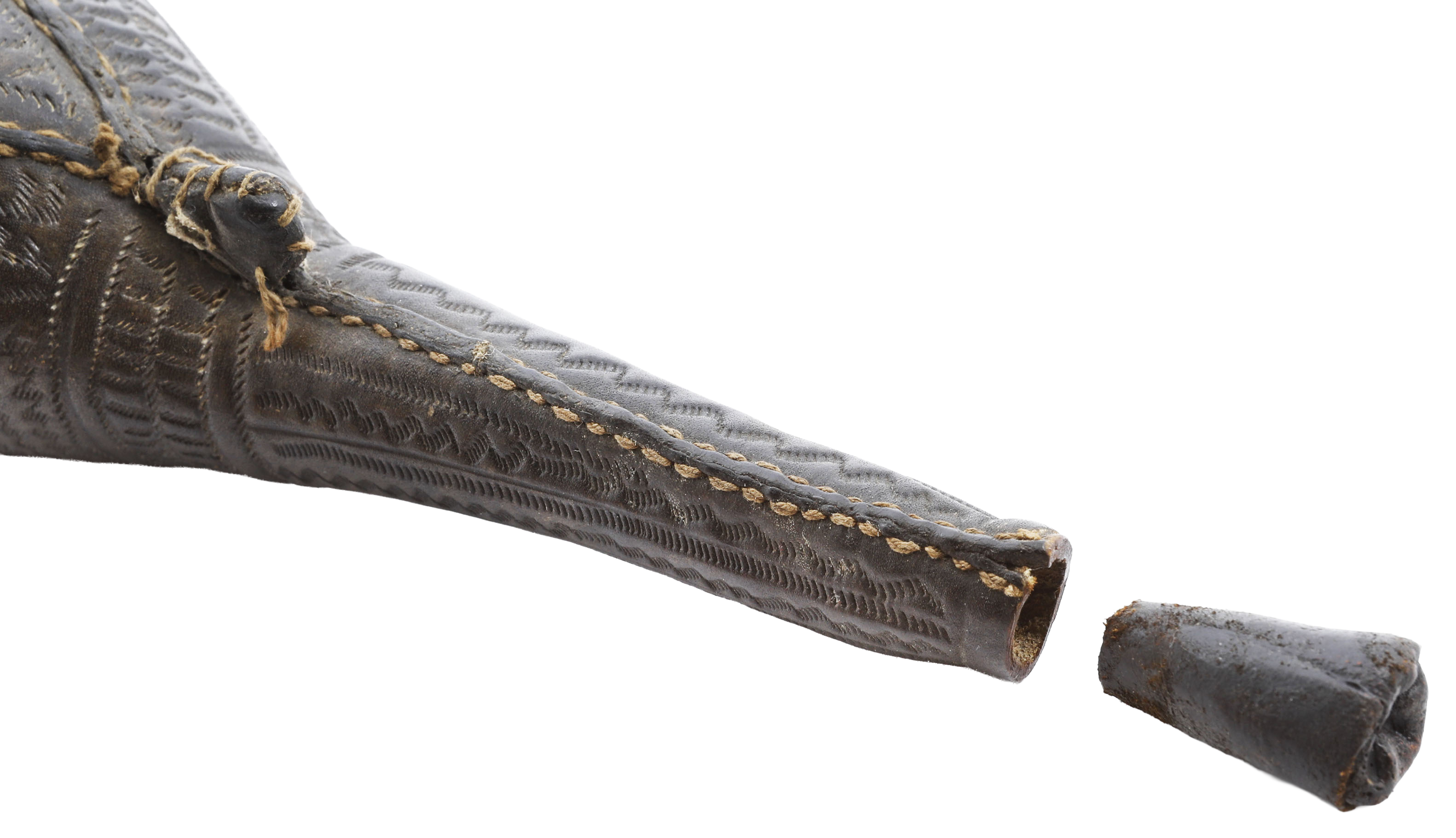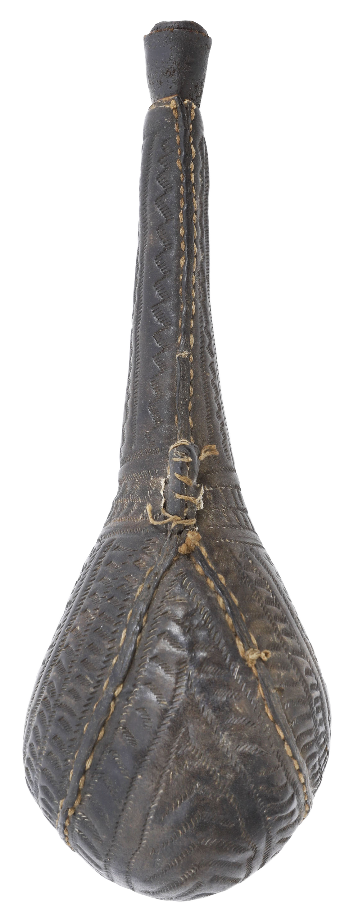 For matchlock musket. 7” height plus the stopper. Molded from two pieces of leather seamed to a semi sphere, like a baseball. The surface nicely tooled throughout in geometric patterns in accordance with Islamic law. Sound, excellent with glossy patina.
