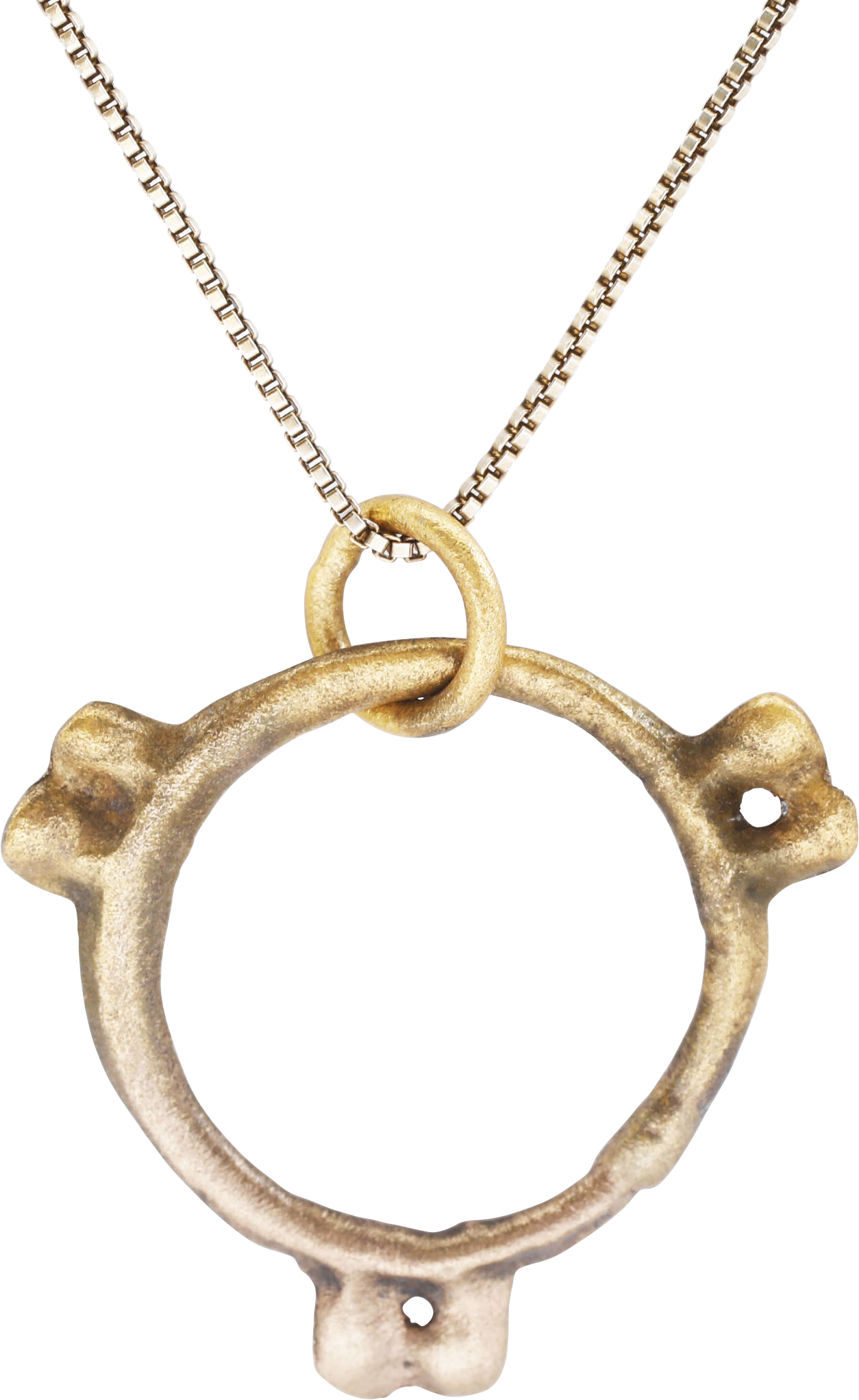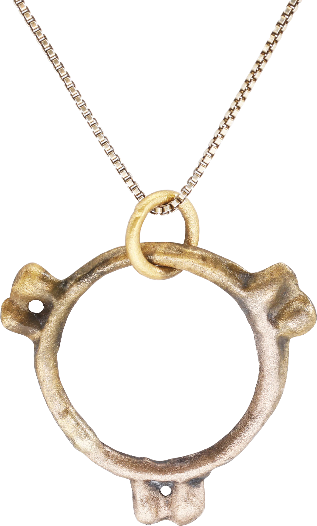 Before the Roman invasion of the British Isles, rings of bronze, silver, and gold were used as a means of exchange, particularly in Ireland. Most exchanges of goods and property were conducted by barter based on shrewd evaluations in each specific situation. Some, need to be more accurately quantified and a system of bronze rings of various sizes evolved. These rings fulfilled that need as well as providing a palpable demonstration of value. They were worn, sewn to men’s leather jerkins as displays of prosperity. A refined subgroup of those rings intricately adorned in floral motifs evolved at the same time. The conspicuous difference between these and the plain counterparts suggests that they were for very specific purposes, probably the bride’s prices. As such, they would have had spiritual significance as well. They accord in form, but vary in detail, having been hand engraved. This example is just under 7/8” (0.85”) diameter with pairs of nubs on stalks at the third points distinguishing it from the more common plain rings, with significant increase in value. Perhaps as a bride’s price. It has been professionally refurbished with the 24karat gold overlay restored and mounted on an 18” gilt Sterling silver neck chain, for contemporary wear. Jewelry gift boxed with a certificate of authenticity.