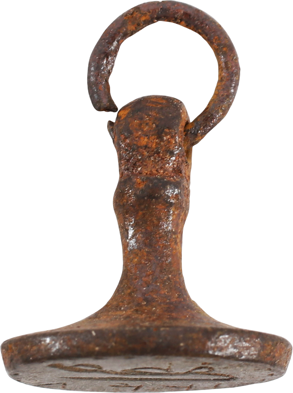 Period of Mehmed IV-Suleiman II. Oval bronze, 5/8" width with chiseled cursive Arabic signature in reverse to wax seal documents. Reverse with a contoured post grip, the tip pierced and mounted with an iron ring, probably a mail link for suspension. Indicative of a noble owner as commoners would seldom endorse documents.
