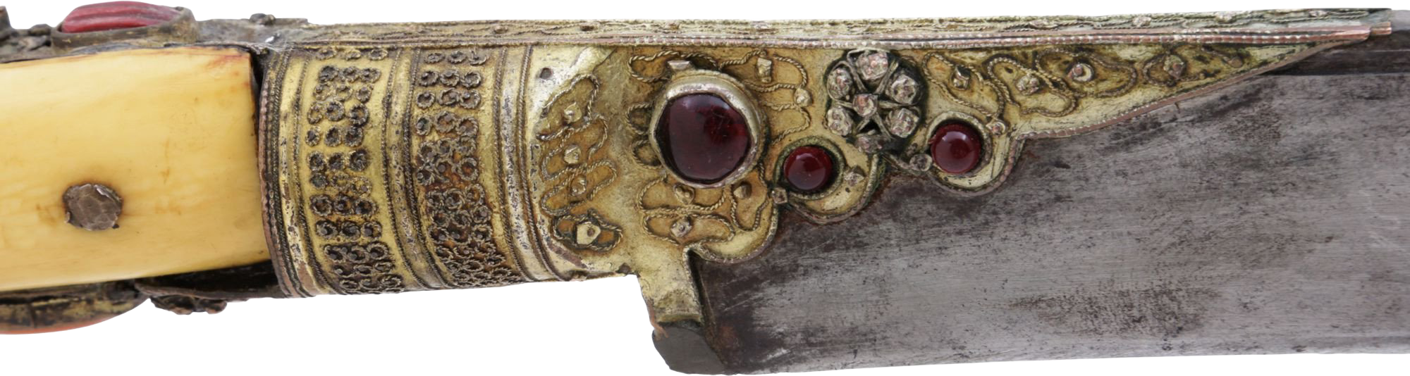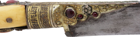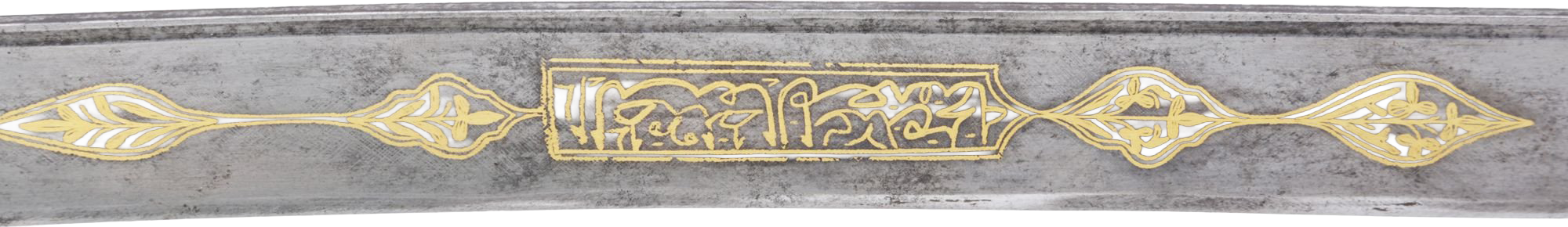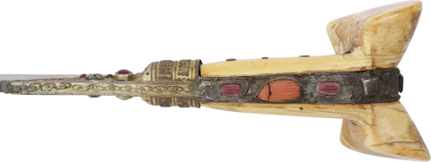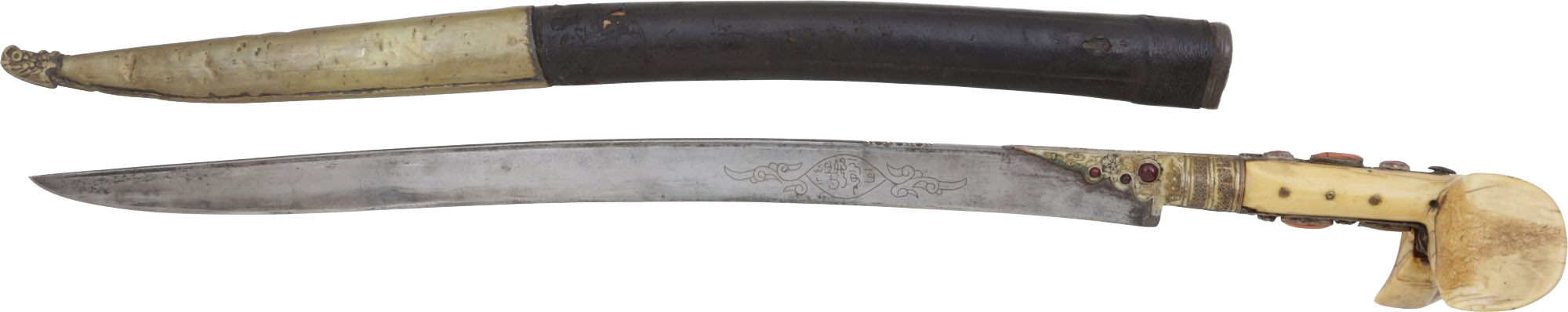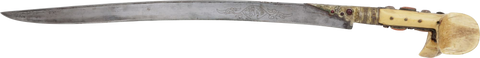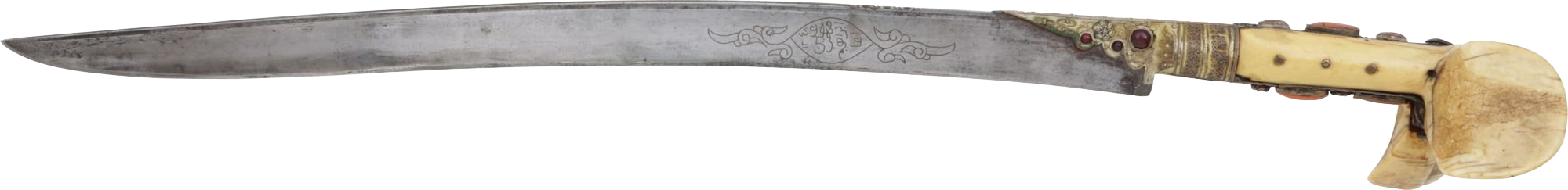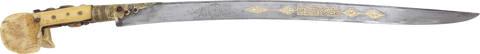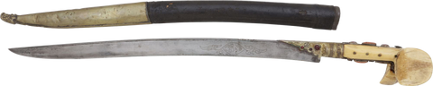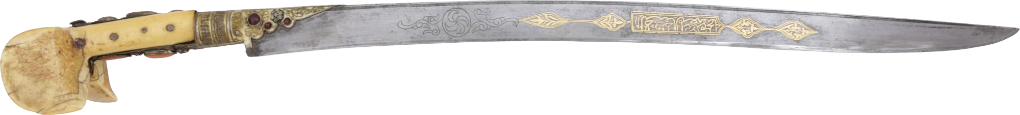 Classic form with large eared walrus ivory grips. See The Arms of Greece and her Balkan Neighbors in the Ottoman Period, Held, pl.006 for a near identical example belonging to Mahmud Dramali Pasha. The tang band with wire filigree and set with corals (one cracked) and mother of pearl. 23 1/2” blade with gilt bolster decorated with wire work and red “stones.” Heavy gold inscription panel to the right side of the blade and gold inlay panel to the left. Brass mounted black ass skin scabbard. An excellent quality and well preserved example of the yataghan in its iconic form.