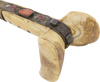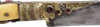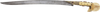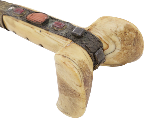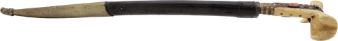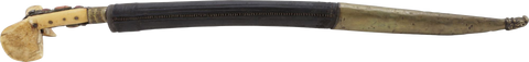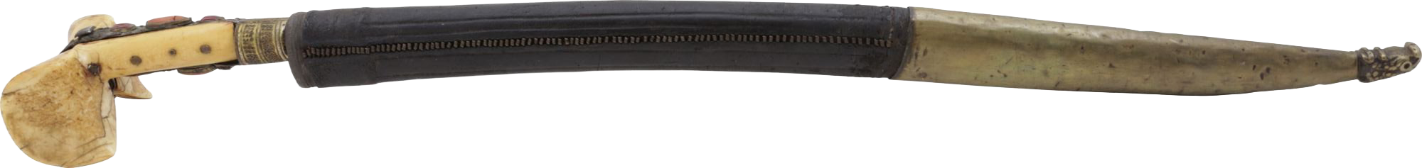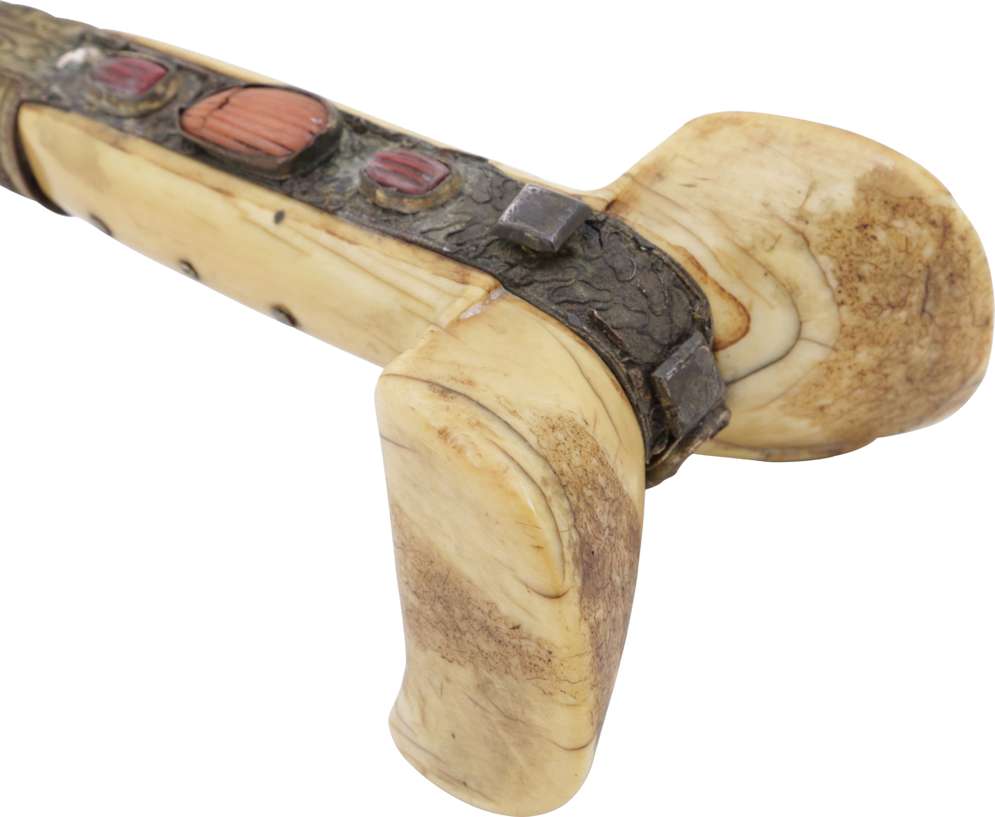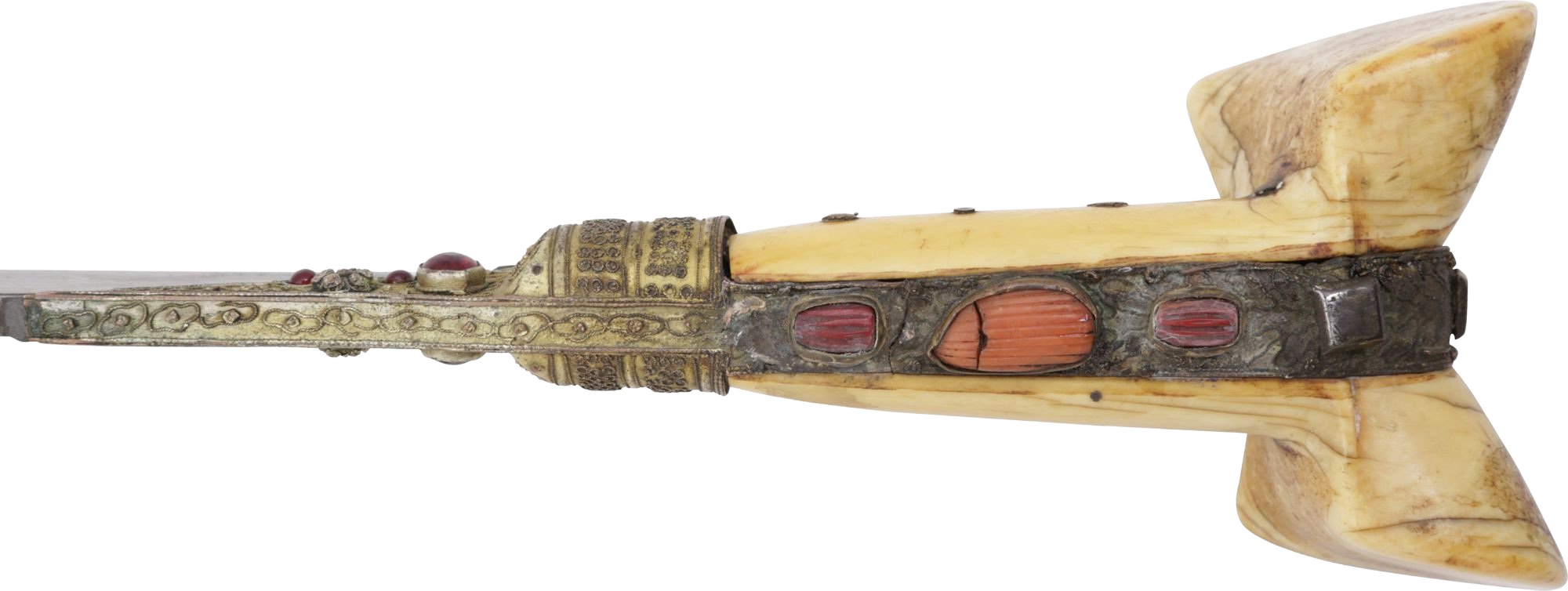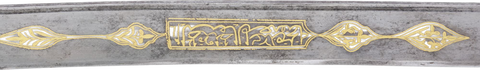 Classic form with large eared walrus ivory grips. See The Arms of Greece and her Balkan Neighbors in the Ottoman Period, Held, pl.006 for a near identical example belonging to Mahmud Dramali Pasha. The tang band with wire filigree and set with corals (one cracked) and mother of pearl. 23 1/2” blade with gilt bolster decorated with wire work and red “stones.” Heavy gold inscription panel to the right side of the blade and gold inlay panel to the left. Brass mounted black ass skin scabbard. An excellent quality and well preserved example of the yataghan in its iconic form.