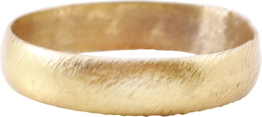 Gilt bronze. Wearable size 8 1/4. 4,2mm width, with low rounded face. Surface lightly textured from burial. Vikings exchanged rings on the pommel of the groom’s sword. Professionally refurbished with the 24karat gold overlay restored. Jewelry gift boxed with a certificate of authenticity.
