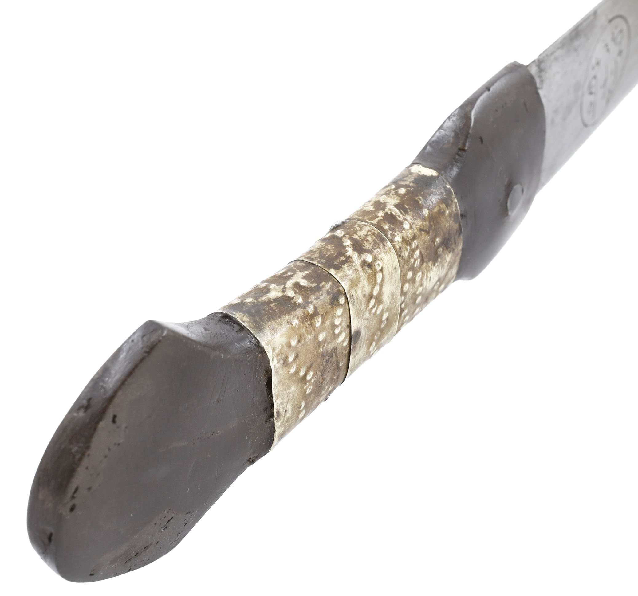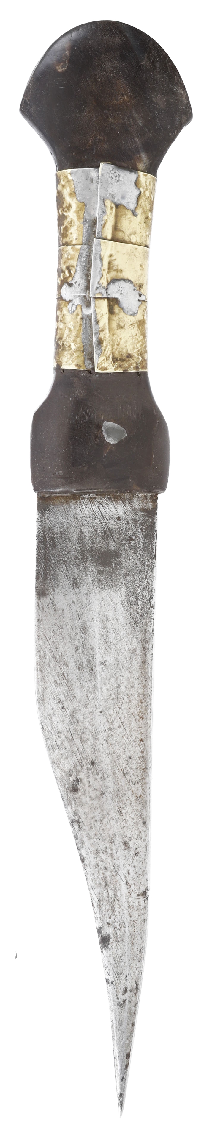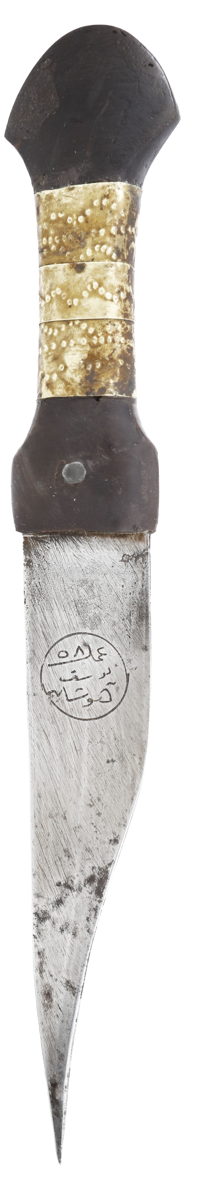 Black horn hilt (small imperfections) with embossed brass grip. 6 ½” slightly recurved blade with light tool finish and engraved Arabic calligraphy seal.
