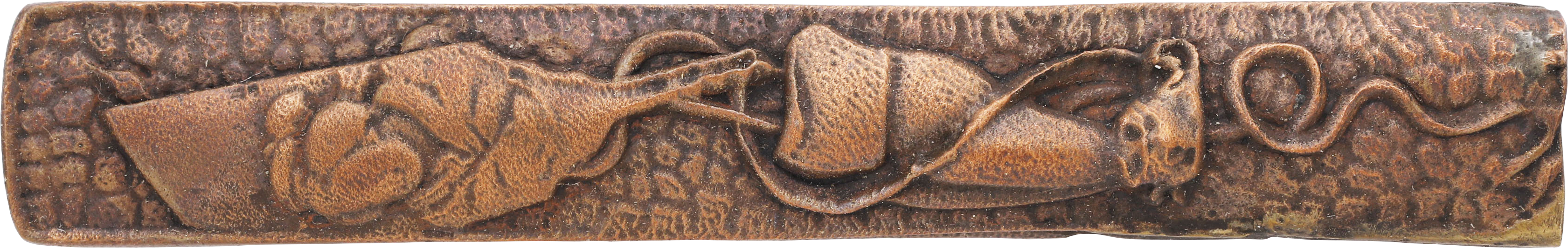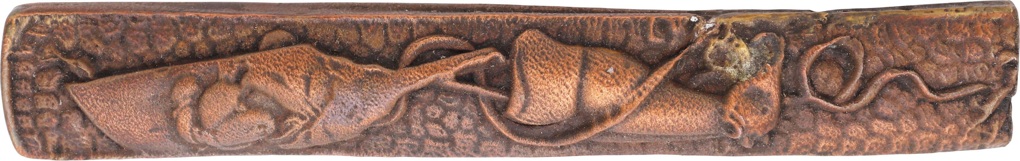 1603-1868. 3 1/2” length of characteristic rectangular form with slightly rounded end. Raised edges and pebble ground with a paddle and fool’s cap.