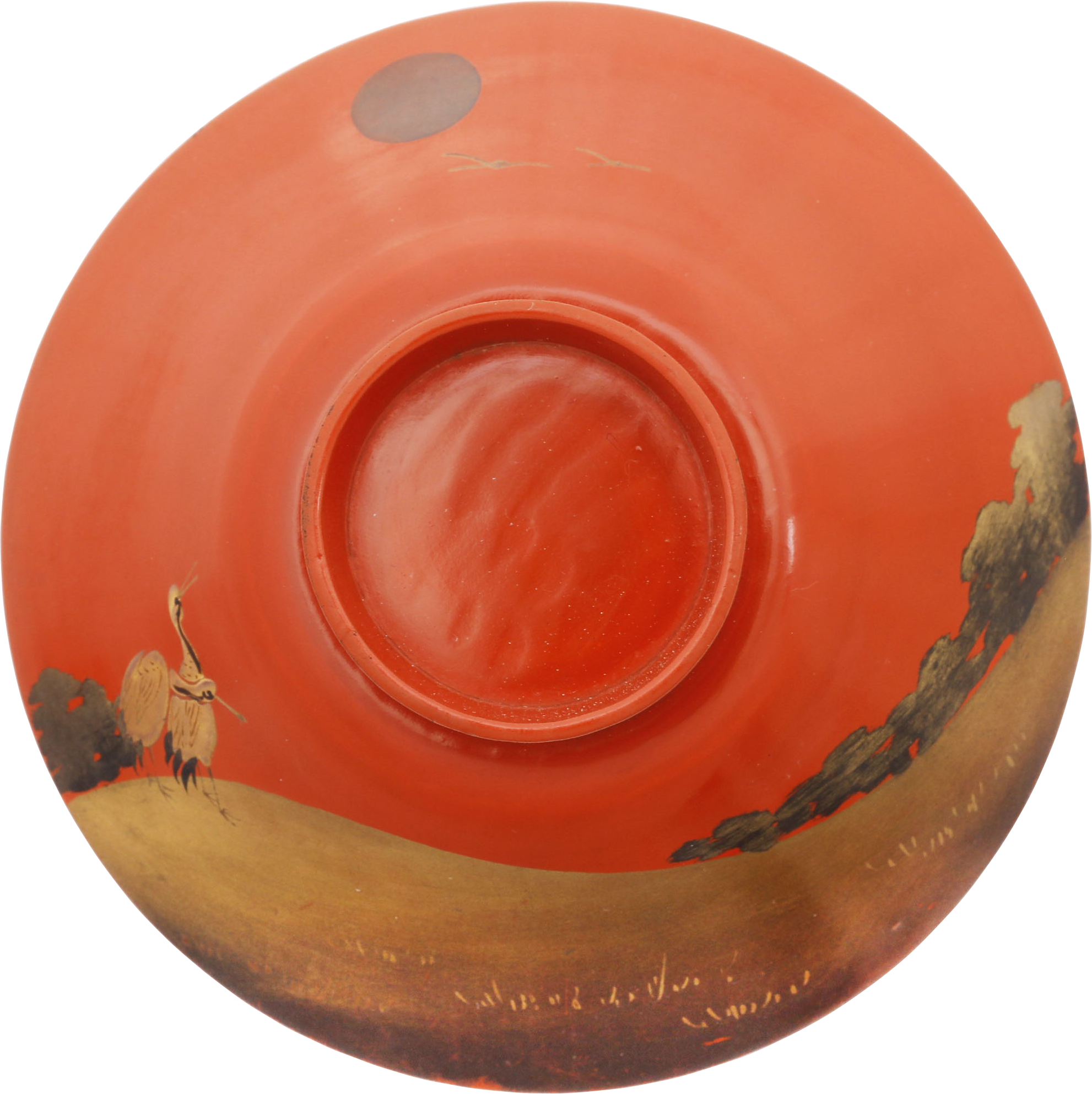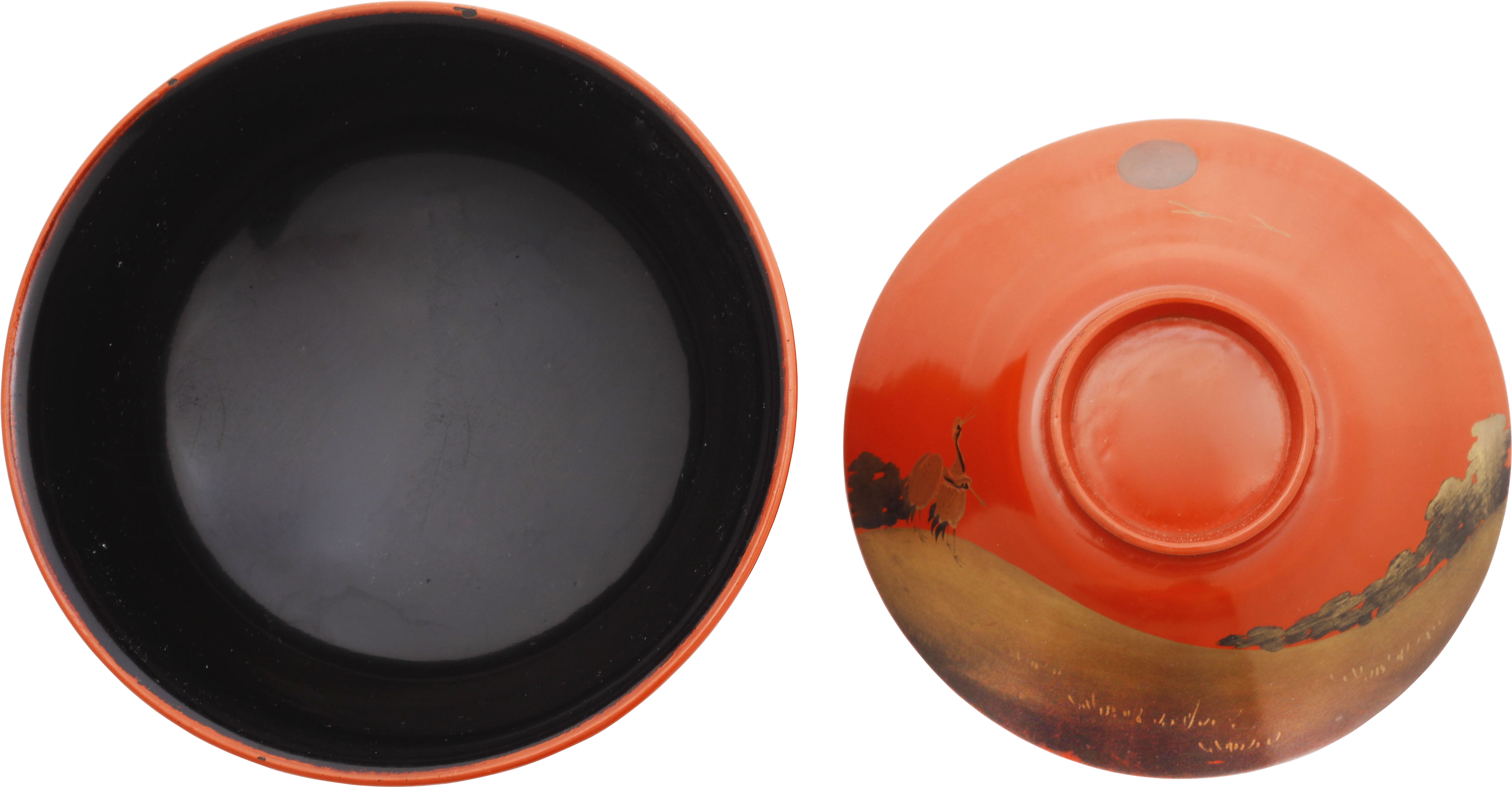 4 5/8” diameter, deeply dished on raised foot. Angled profile top. Orange body color with black interiors. The top finely lacquered in true gold with two cranes atop a hill overlooking a forest. Superior artistry employing the technique of blowing gold dust on the surface for a graded effect.