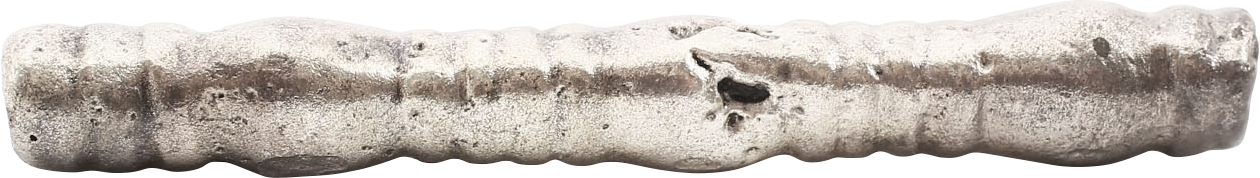A major element from a large and complex aegis form necklace/pectoral display, examples of which are illustrated on the internet. One-piece bronze, over 1 5/8” length and about ¼” diameter, formed as three elongated barrel-shaped beads flanked by reeded segments. Those shapes would have been incorporated in other parts of the necklace as individual beads, interspersed with amulets. Professionally refurbished with the silver surface restored. Gift boxed with certificate of authenticity.