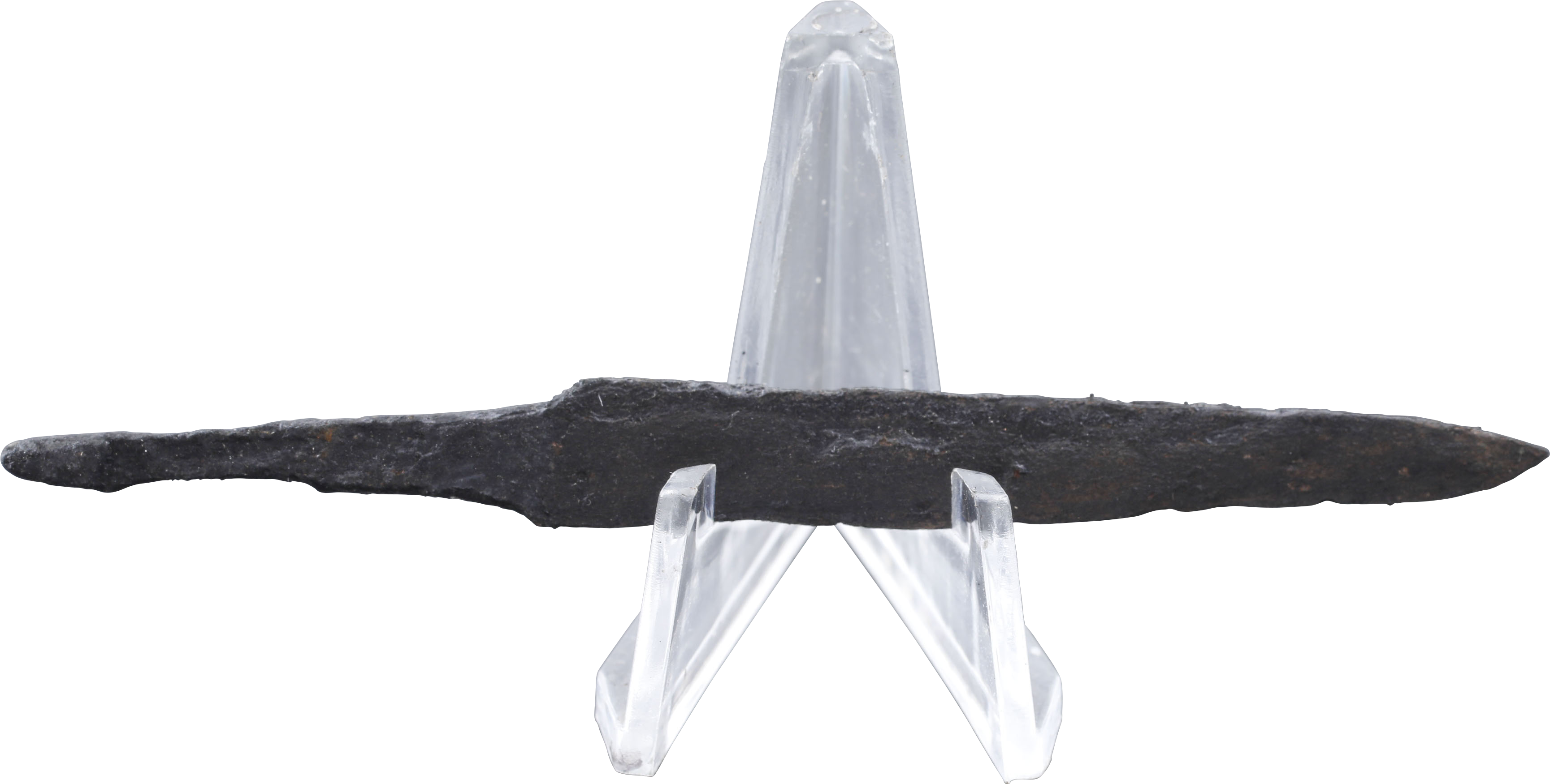 Just under 3 3/8” (3.36”) total length. Wedge section blade for slashing with a slightly dropped point. A vestigial “false edge”. Whittle tang, to secure it to the wood, bone, or antler grip, now perished. (See Leather Working Reverend website and Inhabitat website for similar examples with original grips.) Stable oxidation with a good profile, as typical for water, finds. These side or pouch knives were among the most treasured possessions for Vikings, rather than the large seax with which they were buried. They likely had spiritual significance to the owner during his life. A fine weapon, suitable for throat slashing as well as organ depth thrusting attacks. Excavated and professionally conserved with Plexiglas display easel and Certificate of Authenticity.